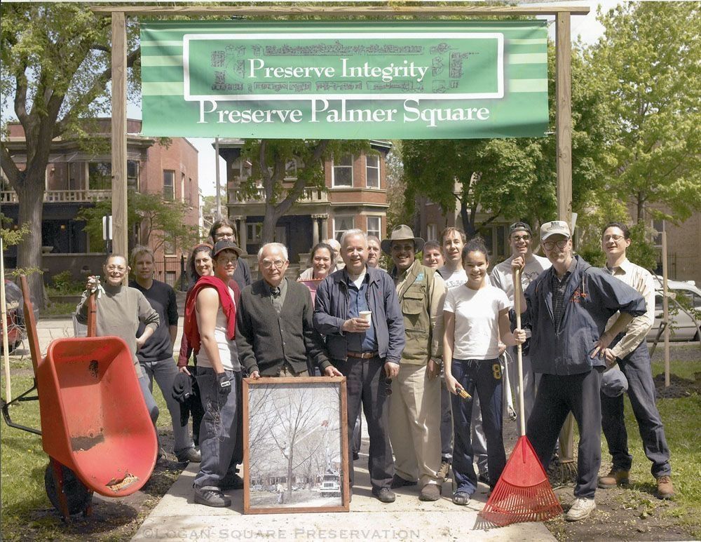 Digital photo print portrait of group of volunteers standing with rakes, wheelbarrow and framed photograph of tree trimming in front of wood gateway with green Preserve Palmer Square banner, circa 2005Photograph Details