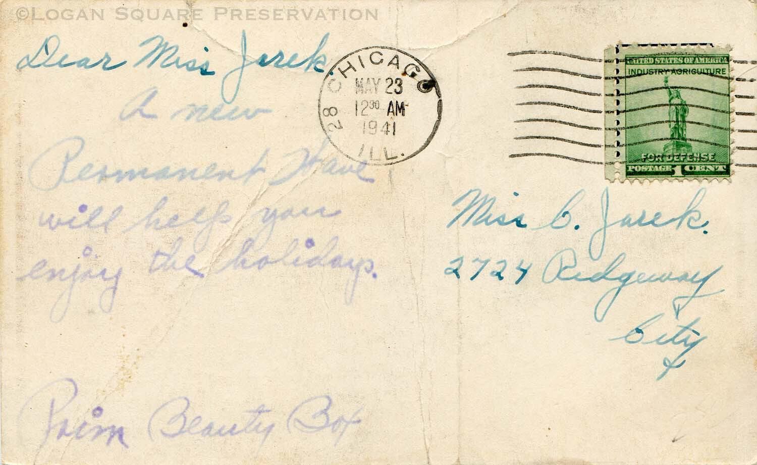 Promotional postcard with image of woman with permed hair sent by Prim Beauty Box to encourage Miss. C. Jarek to come in for a permanent wave before Memorial Day, 1941Subject Person/Organization