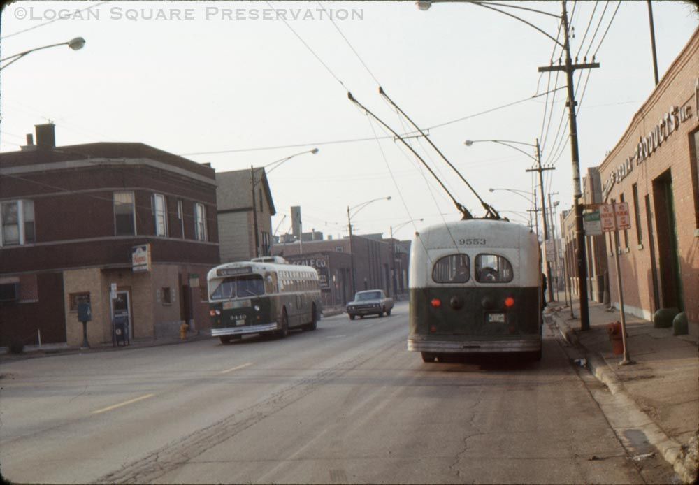 35mm color Ektachrome slide transparency looking south on Pulaski Rd at southbound and northbound electric trolley busses #9553 and #9440 passing corner tavern and brick industrial buildings during last year of trolley bus operation, Feb 27, 1973Photograph Details