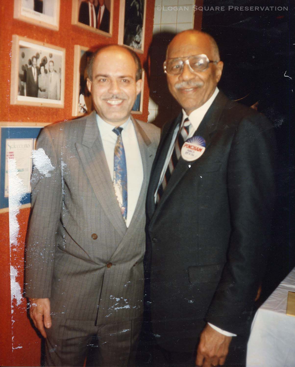 Portrait of candidate for Cook County State's Attorney Eugene Pincham with Tania's Restaurant owner Elias Sanchez standing near wall of framed politician photos, circa 1996Photograph Details