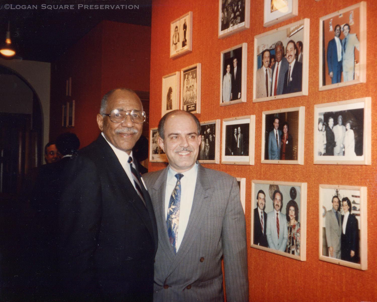 Portrait of candidate for Cook County State's Attorney Eugene Pincham with Tania's Restaurant owner Elias Sanchez standing near wall of framed politician photos, circa 1996