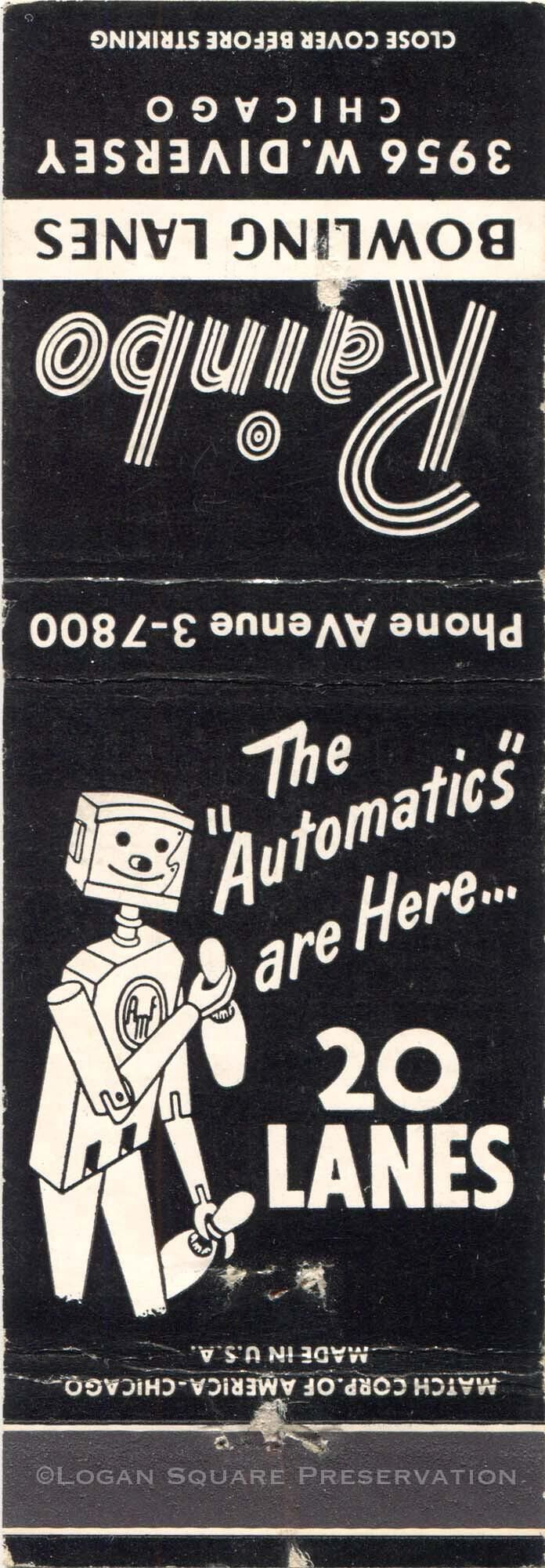 1.5" matchbook in black ink with cartoon illustration of robot pinsetter, circa 1960sPublication Details