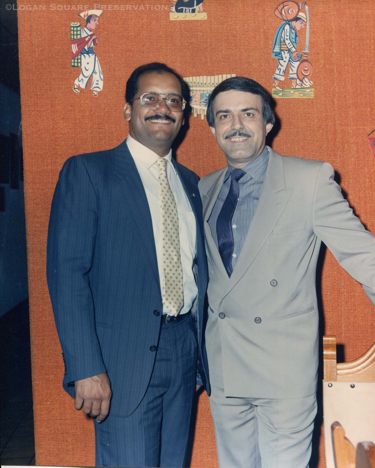 Portrait of 31st Ward alderman Ray Figueroa and Tania's Restaurant owner Elias Sanchez standing against orange wall with cutout paper images, circa 1987Photograph Details