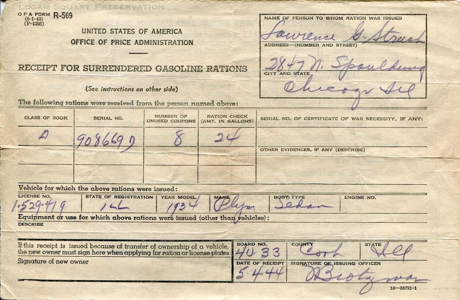 Receipt for Surrendered Gasoline Rations for credit of 24 gallons from sale of 1934 Plymouth sedan by Lawrence Strush, May 4, 1944Collection