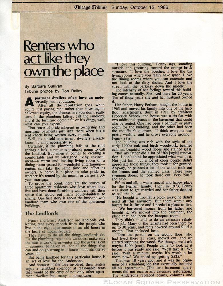 Newspaper clippings of text from article on Logan Square tenants pasted on three pages, October 1986Collection