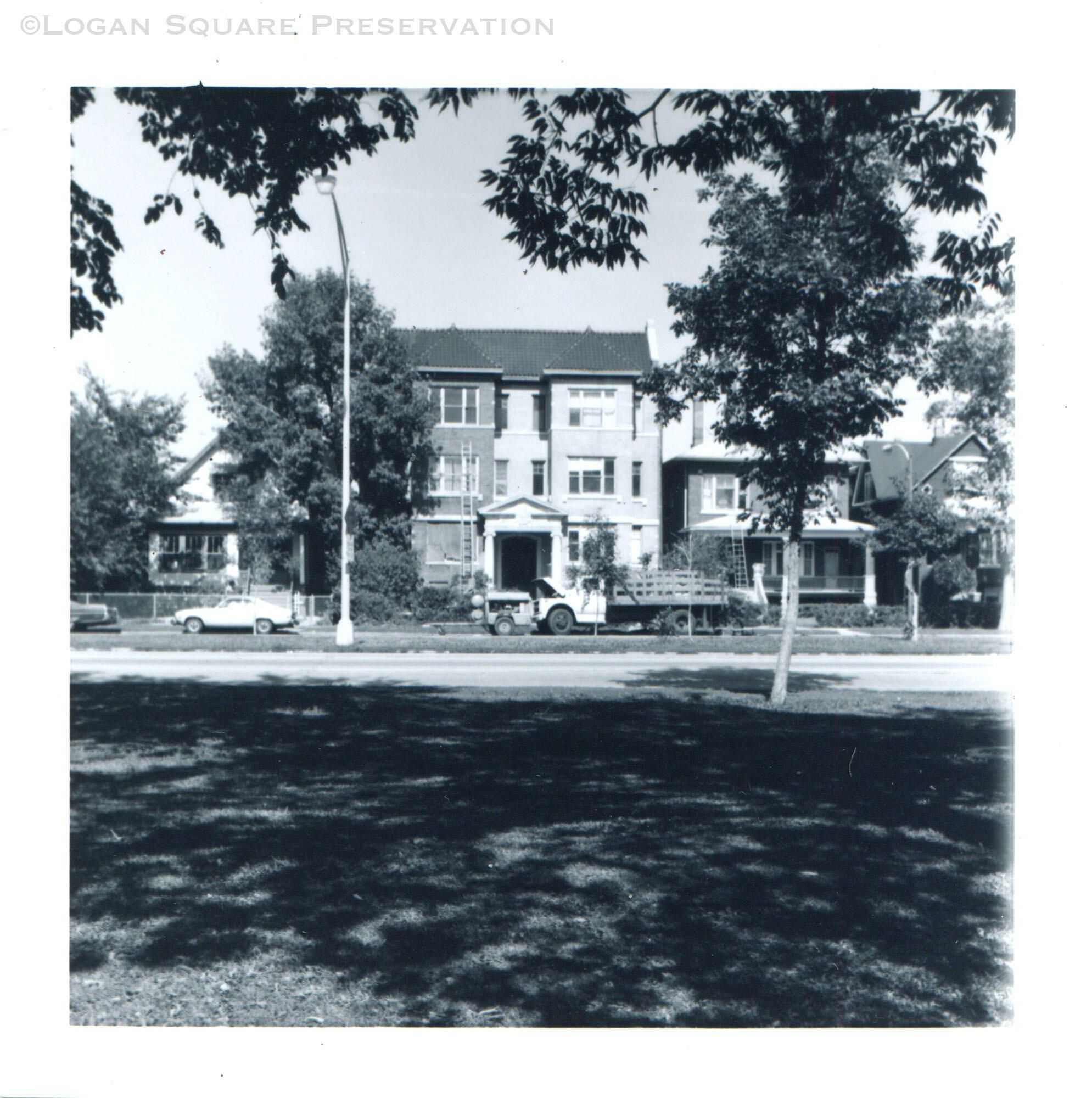 Photo view looking north across boulevard at workmens' truck and ladder against wall of 2546 W. Logan BlvdPhotograph Details
