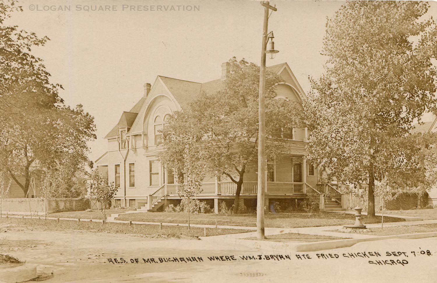Real-photo postcard view looking northwest at frame Victorian house with decorative arched bargeboard screens on corner lot at Altgeld St & Central Park Ave where presidential candidate William Jennings Bryan enjoyed a fried chicken dinner hosted by ironworker and congressional candidate Frank Buchanan and his wife Minnie on Sept 7, 1908Subject Person/Organization