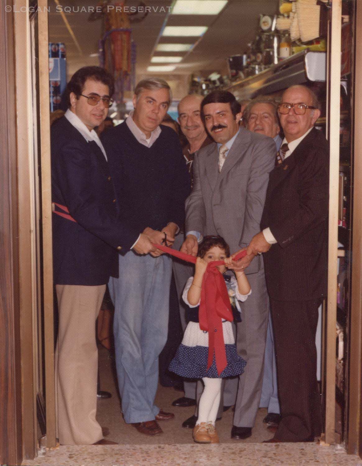 Snapshot photo of men gathered behind red ribbon across doorway opening from front grocery store to back dining area at Tania's Grocery / Restaurant, circa early 1980sPhotograph Details