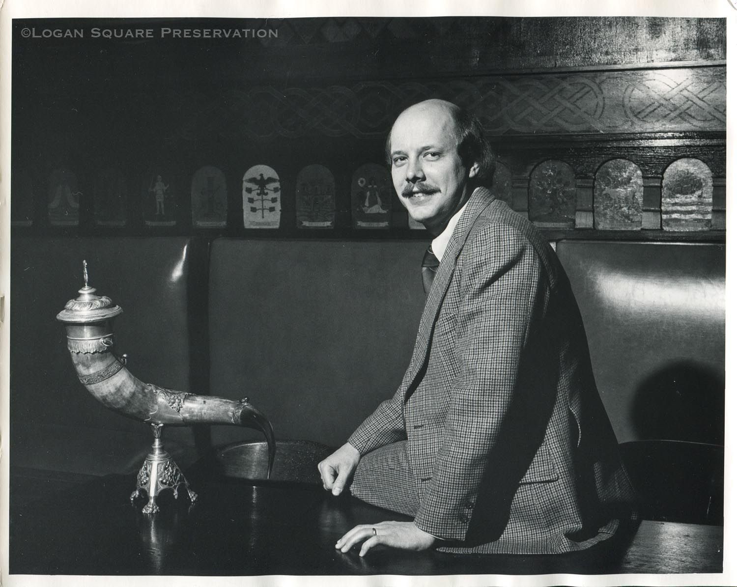 Portrait of Robert Alsaker sitting on table next to drinking horn in banquet room of the Norske Klub, circa 1980sPhotograph Details