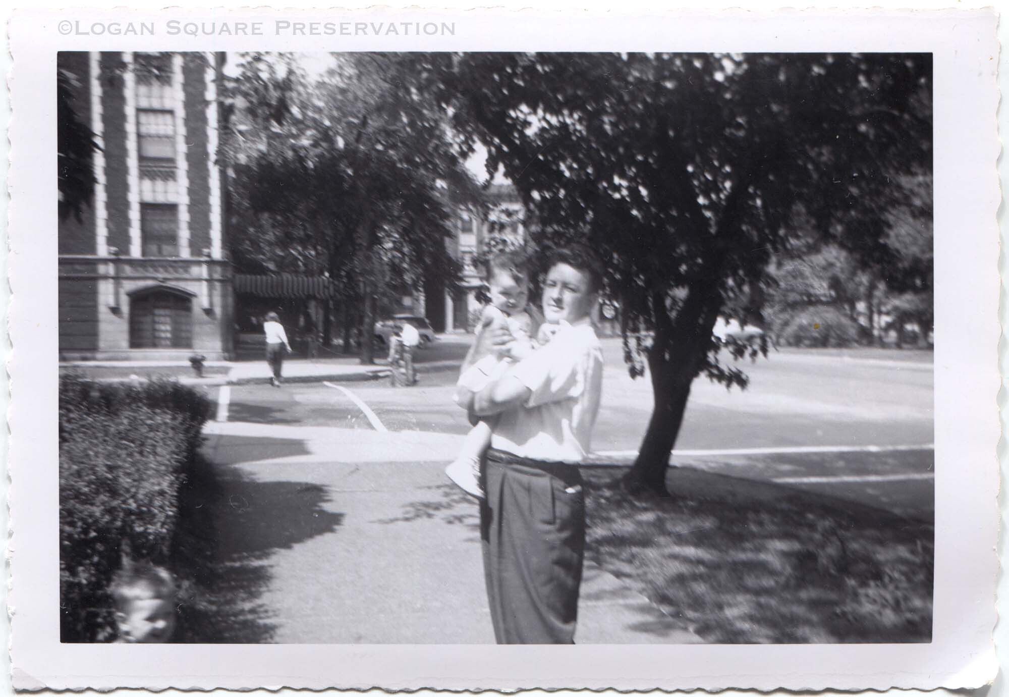 Snapshot photo of Robert Markey holding child on sidewalk in front of 2556 N. Kedzie with Logan Vista apartments and buildings on north side of Logan Square visible in background, 1952Photograph Details