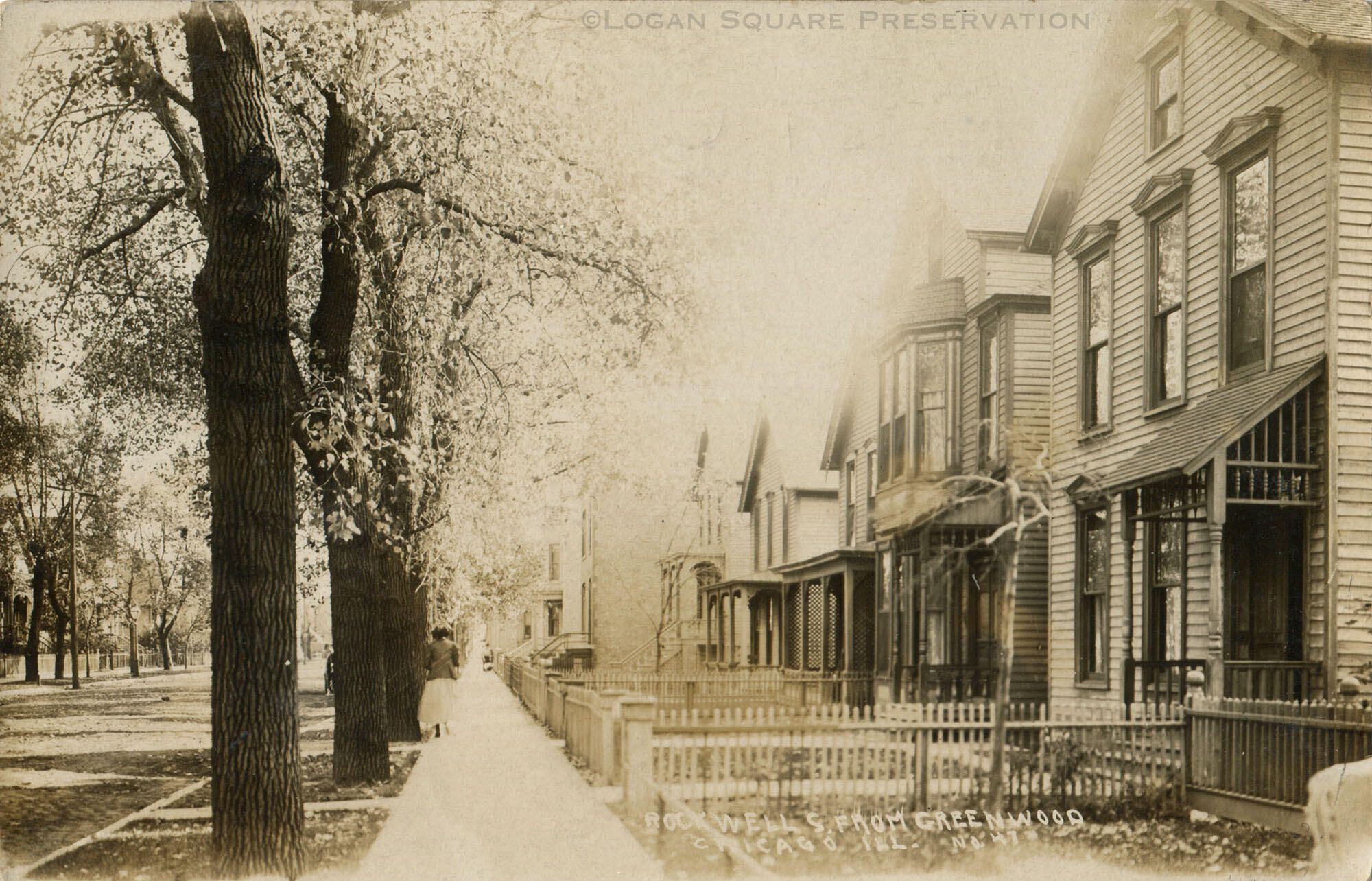Real-photo postcard view looking south at frame houses on west side of 2400 block of N. Rockwell St south of Altgeld St (formerly Greenwood Ave), circa 1910Subject Place