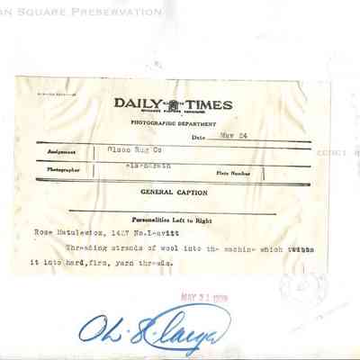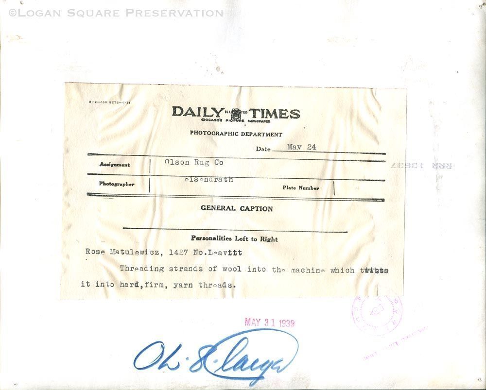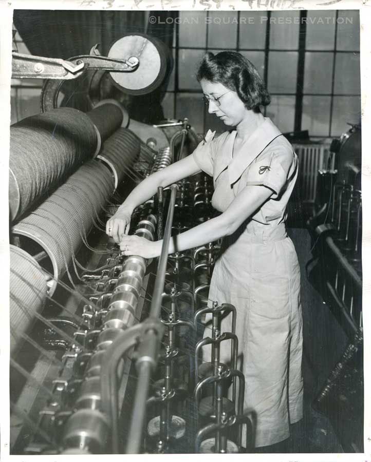 News photo of Olson Rug Factory worker Rose Matulewicz setting up wool threads for rug-making loom, 1939Photograph Details