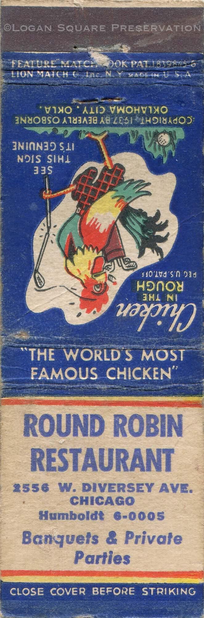 1.5" matchbook printed on blue background with logo of golfing Chicken in the Rough franchise on back, "The World's Most Famous Chicken", circa 1950sPublication Details