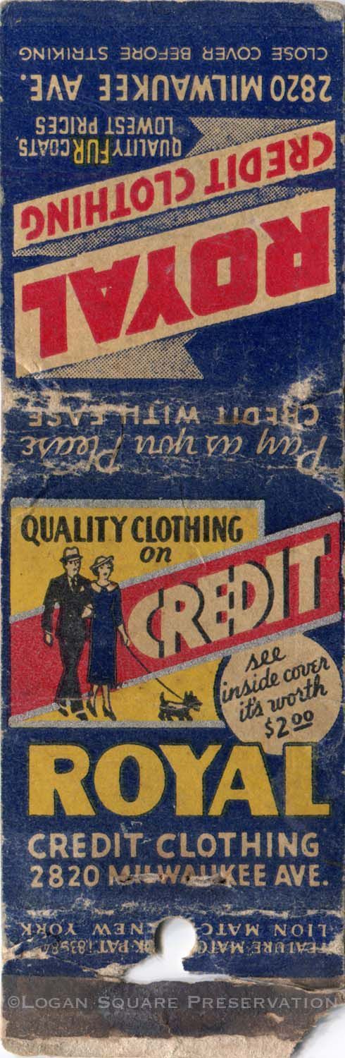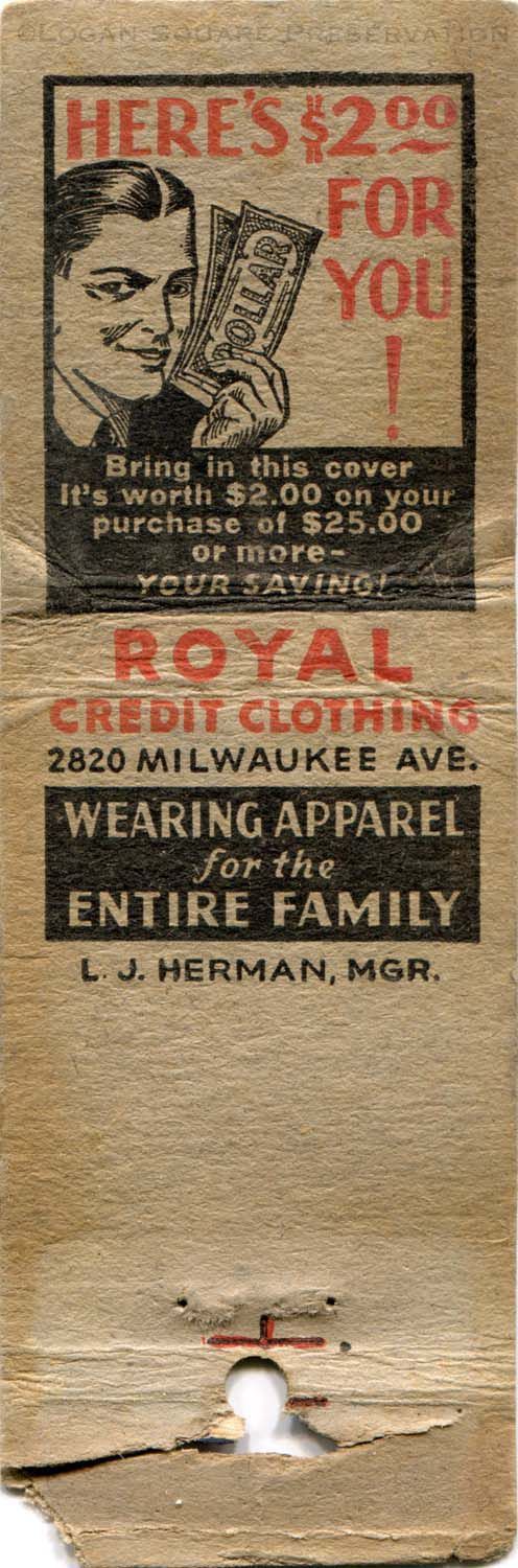 1.5" matchbook printed in red, blue & yellow ink with stock illustration of man and woman walking dog and offer for $2 credit on inside, circa 1934-1942Publication Details