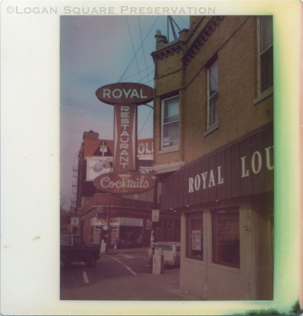 Polaroid instant photo of exterior and sign of Royal Restaurant looking west along Fullerton facade of building, circa 1970s-1980sPhotograph Details