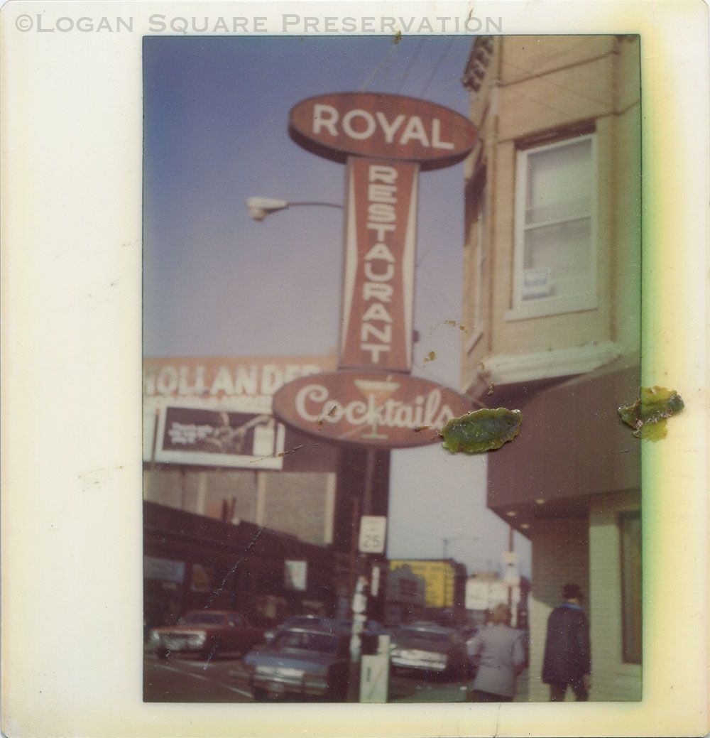 Polaroid instant photo of sign hanging above entrance of Royal Restaurant, looking northwest up Milwaukee Ave, circa 1970s-1980sPhotograph Details