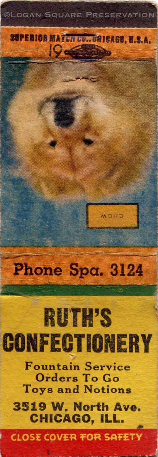 1.5" matchbook with photograph of chow dog breed on back for Ruth's Confectionery soda fountain, circa 1940sPublication Details