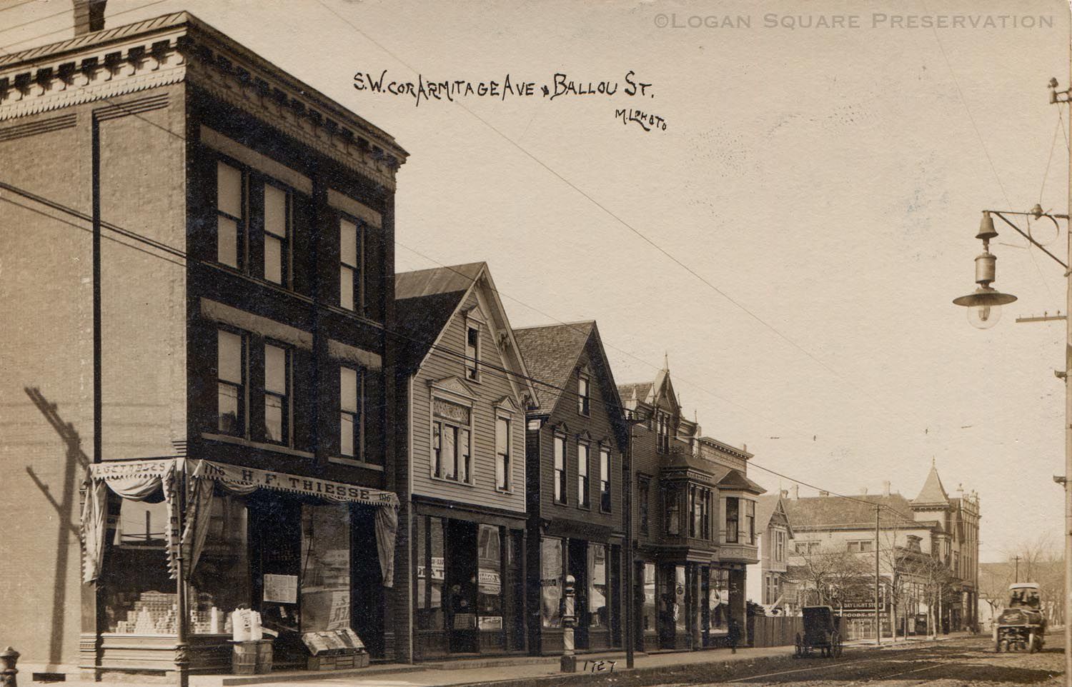 Real-photo postcard view of mixed-use storefronts on south side of 3501 block of Armitage Ave west of St. Louis Ave (formerly Ballou St) on winter day, circa 1910Subject Person/Organization