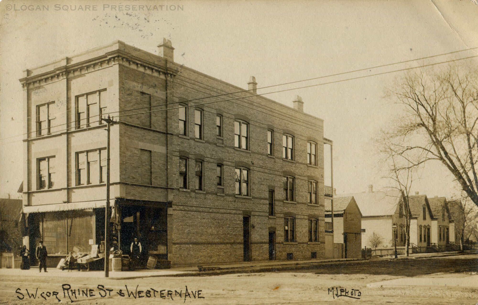 Real-photo postcard view of brick storefront with apartments above (built 1905) at southwest corner of Belden (formerly Rhine St) & Western Ave, circa 1907-1908. Row of four workers cottages visible farther down Belden Ave.Subject Person/Organization
