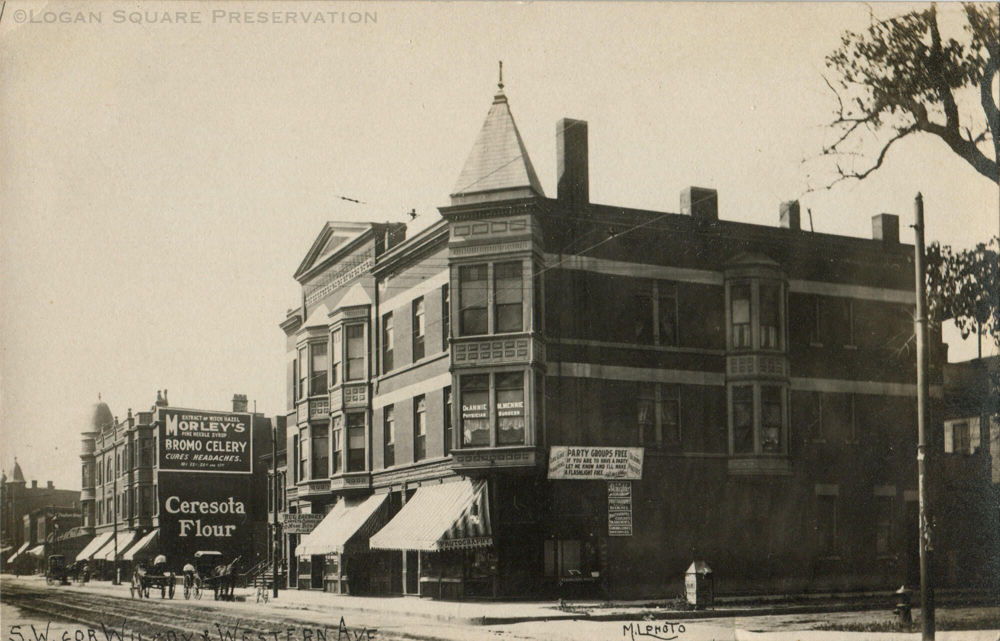Real-photo postcard view looking southwest at no-longer-extant brick apartments and storefronts, circa 1907-1908Subject Place
