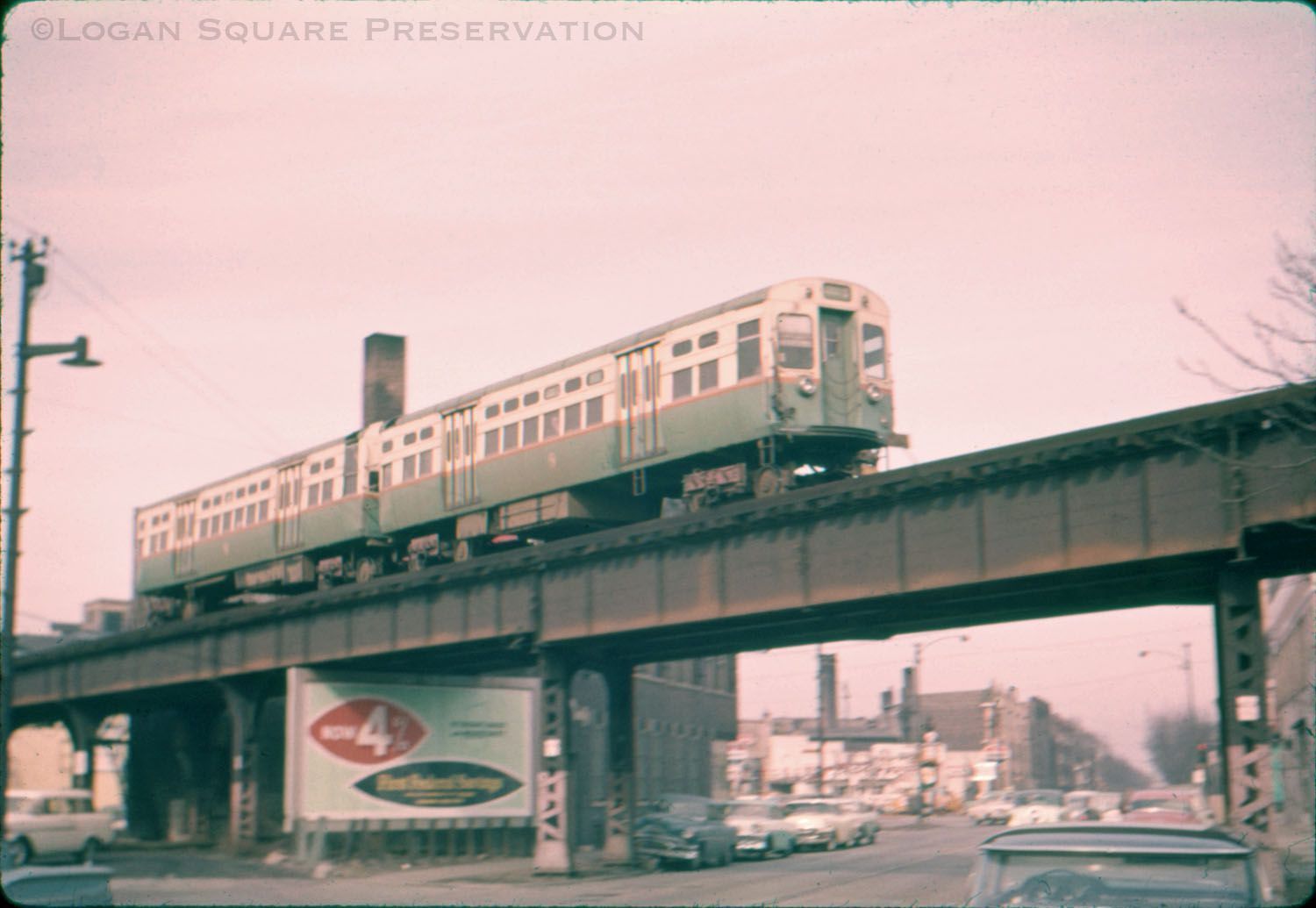 35mm Ektrachrome color slide transparency view of 2-car southbound CTA train passing over Sacramento Avenue with parked cars and billboard underneath, 1960Photograph Details