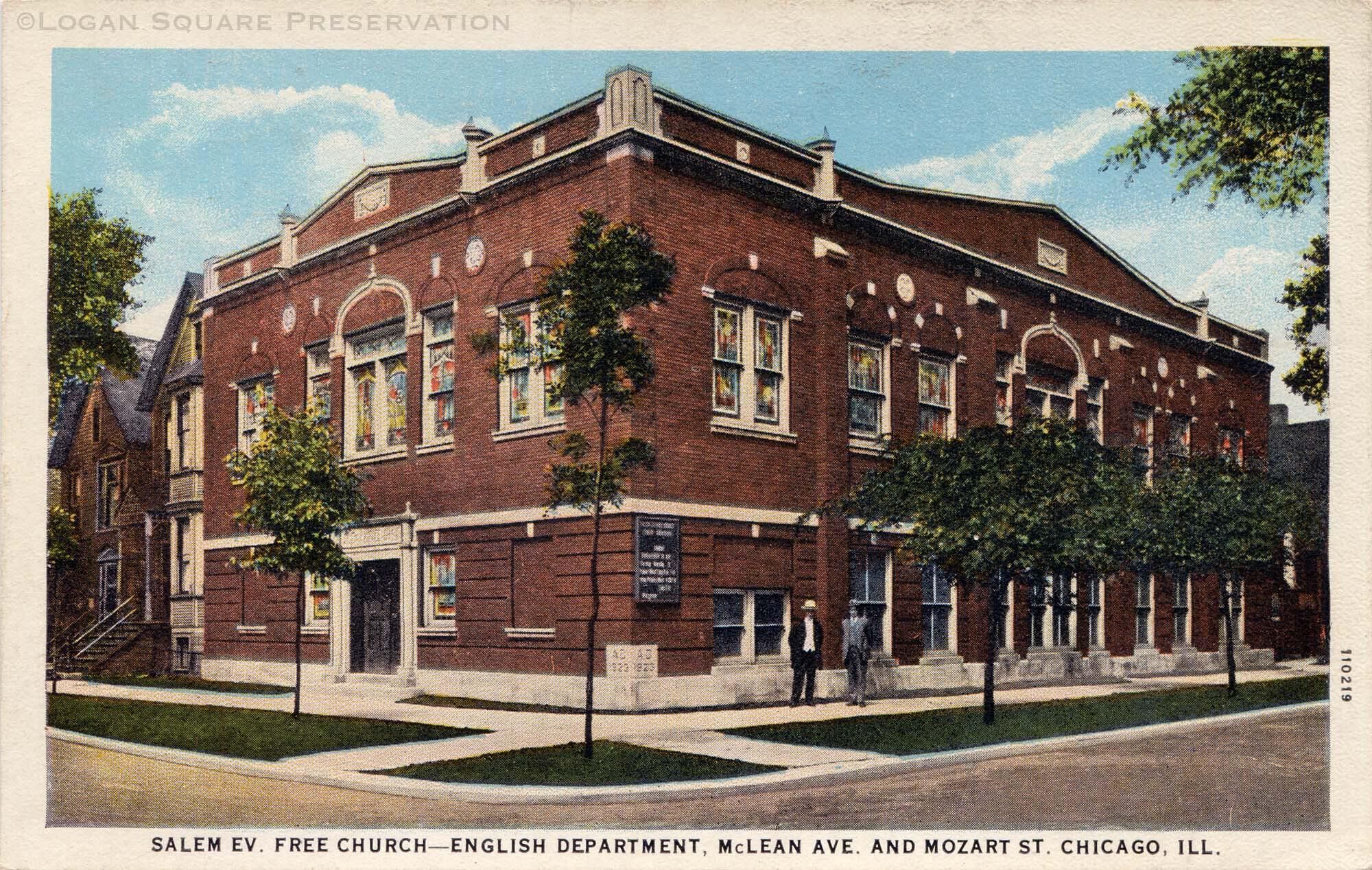 Colorized postcard view looking northeast at no-longer-extant brick church building at corner of McLean Ave and Mozart St., circa 1925Subject Person/Organization