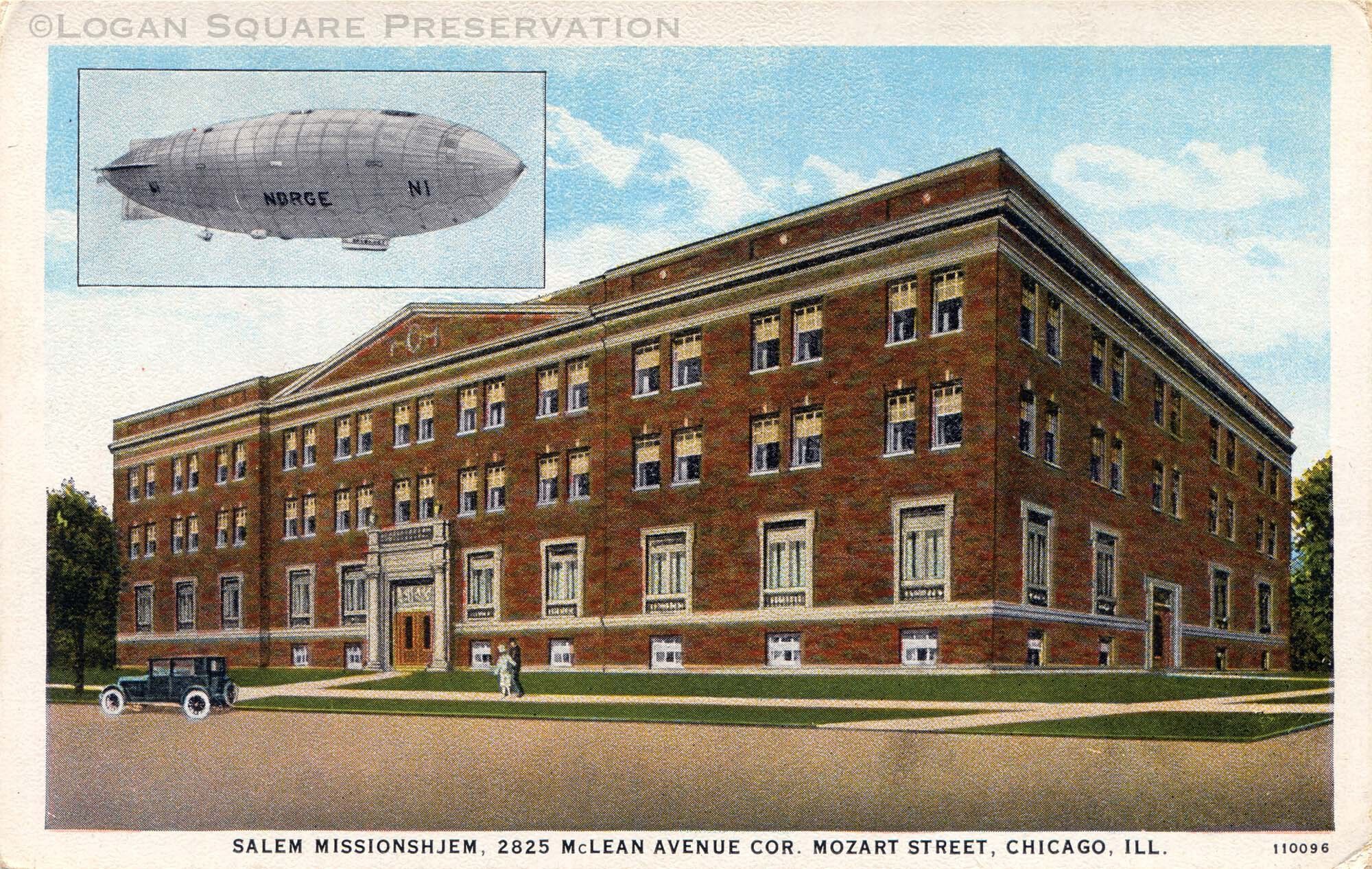 Colorized lithograph postcard with view of northwest corner of 3-story brick Salem Mission Home with automobile parked in front and inset photo of Norge airship, circa 1926Subject Person/Organization