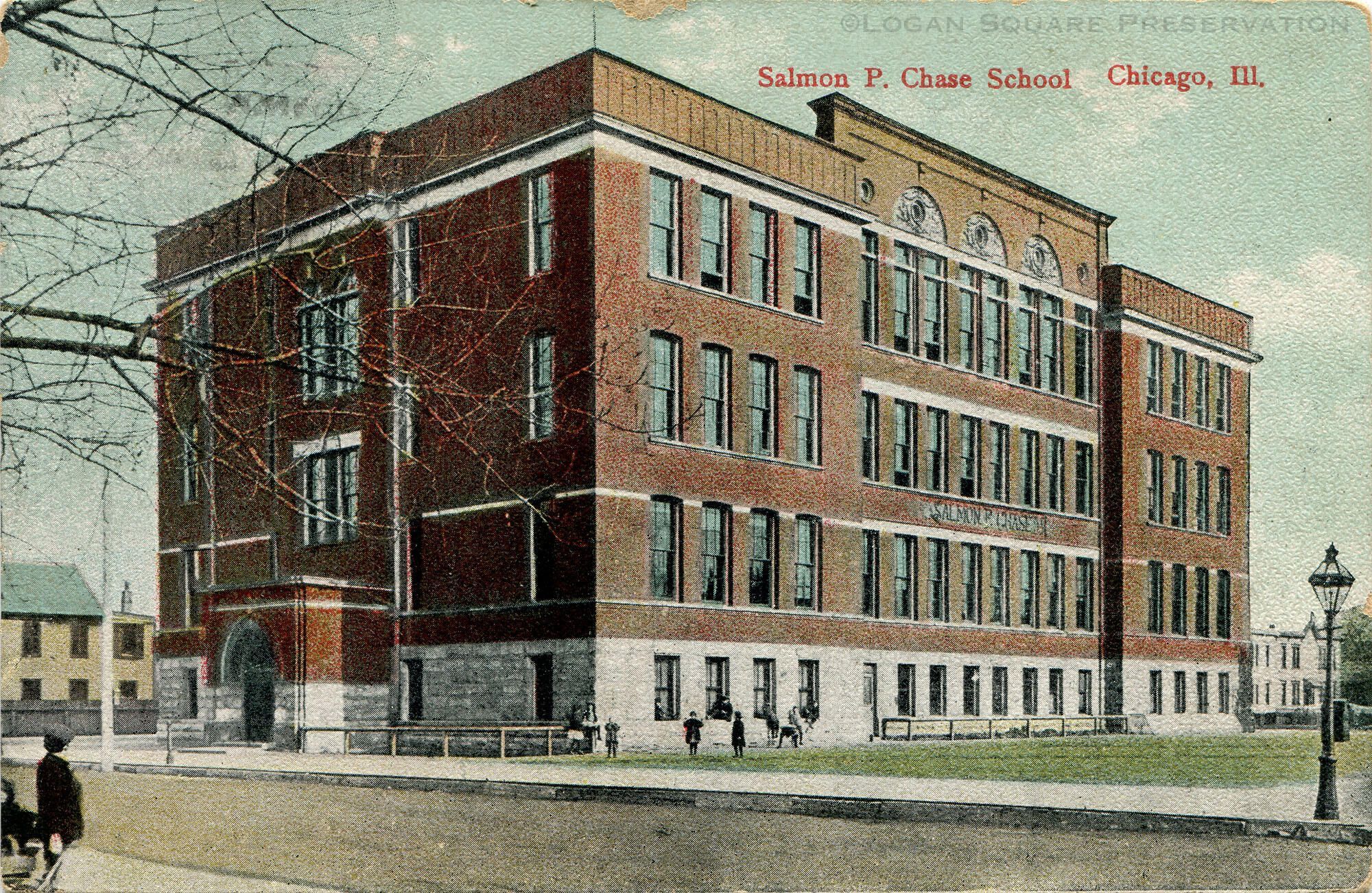 Colorized lithograph postcard view looking east at front of Chase Elementary School with children climbing on windowsills at base of building, circa 1911Subject