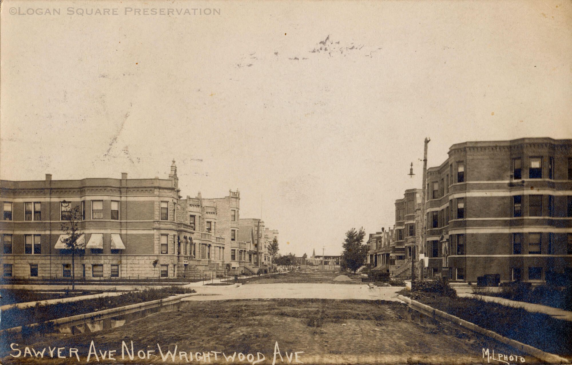 Real-photo postcard view looking north at 2600 block of Sawyer Ave from Wrightwood toward Callahan's baseball park in distance, circa 1910Subject