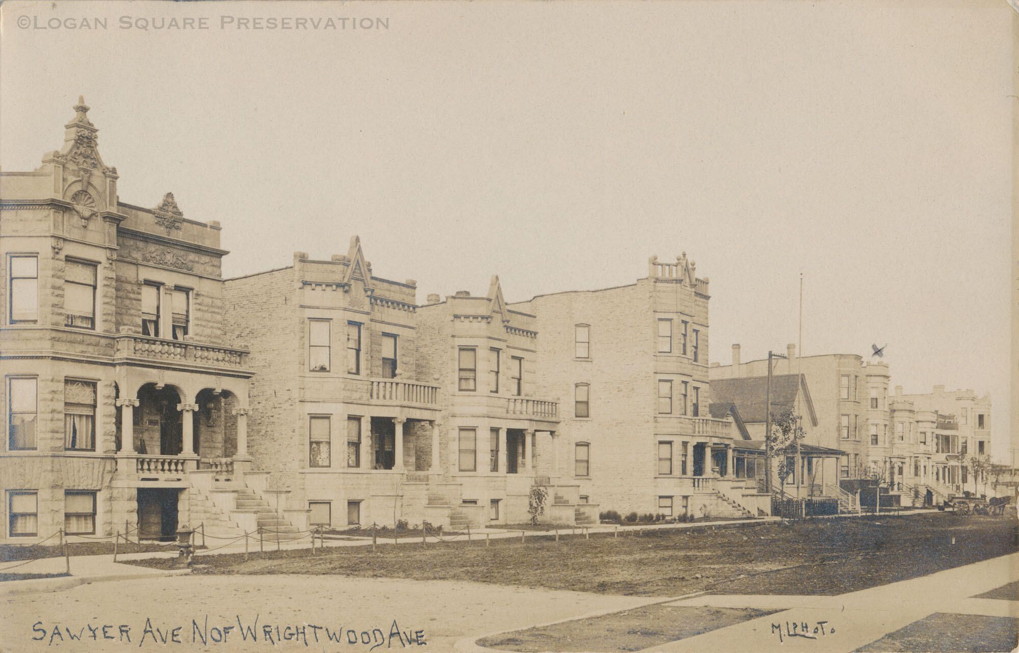 Real-photo postcard view of greystone flats on west side of 2600 block of N. Sawyer Ave., circa 1907-1909. Apartment at 2628 N. Sawyer marked with "X".Subject