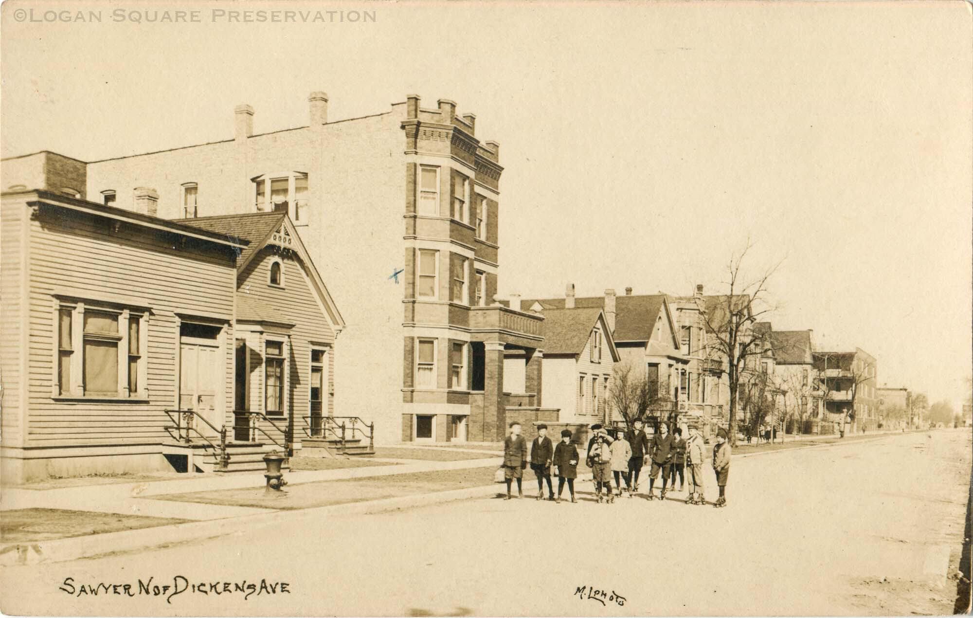 Real-photo postcard view looking northwest at group of children (some wearing roller skates) in street in front of row of cottages and flats on west side of 2100 block of Sawyer Ave, circa 1912. Second floor of 3-flat marked with X.Subject Place