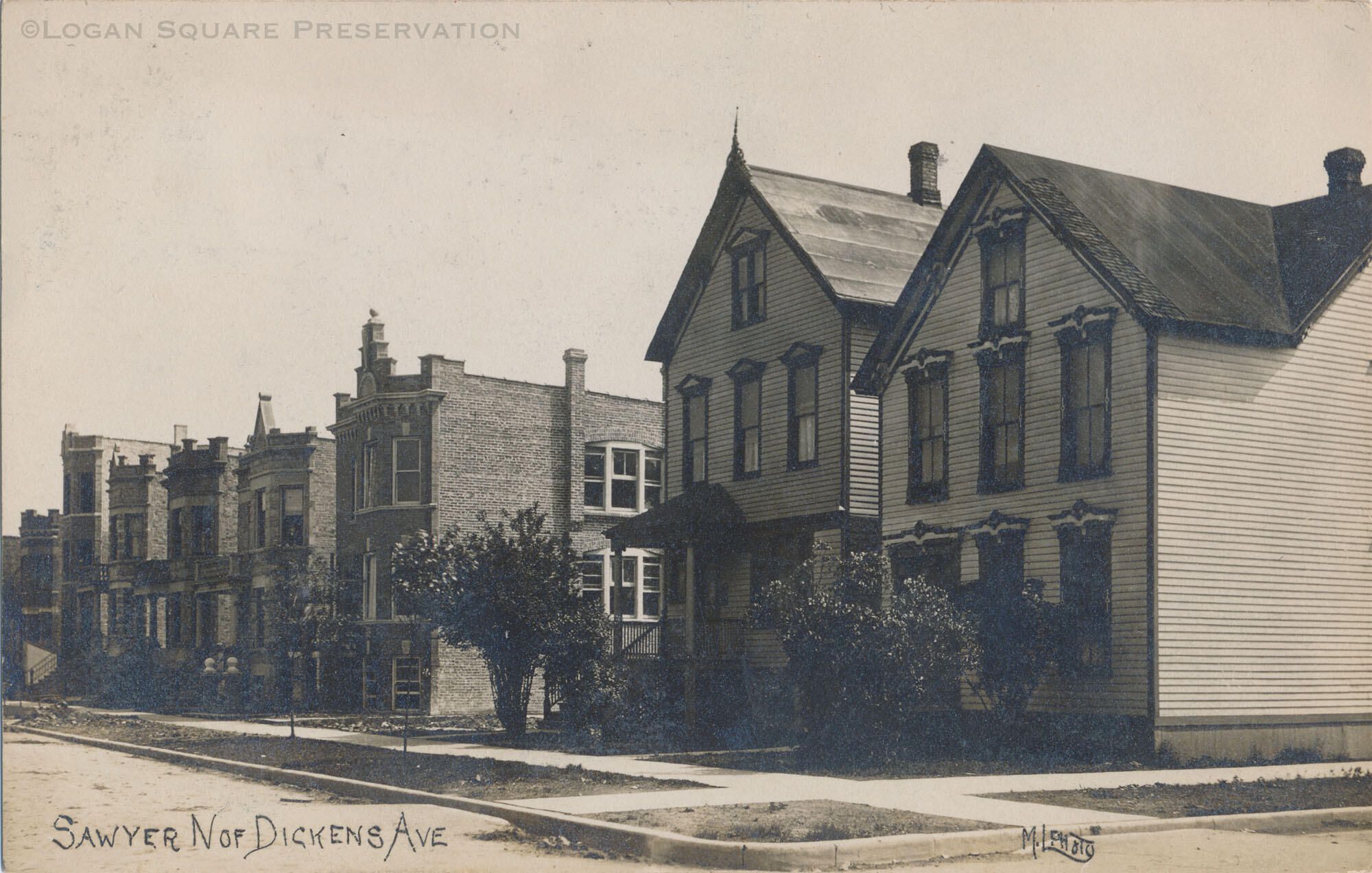 Real-photo postcard view looking northeast at frame houses and two-flats on east side of 2100 block of Sawyer Ave, circa 1909Subject