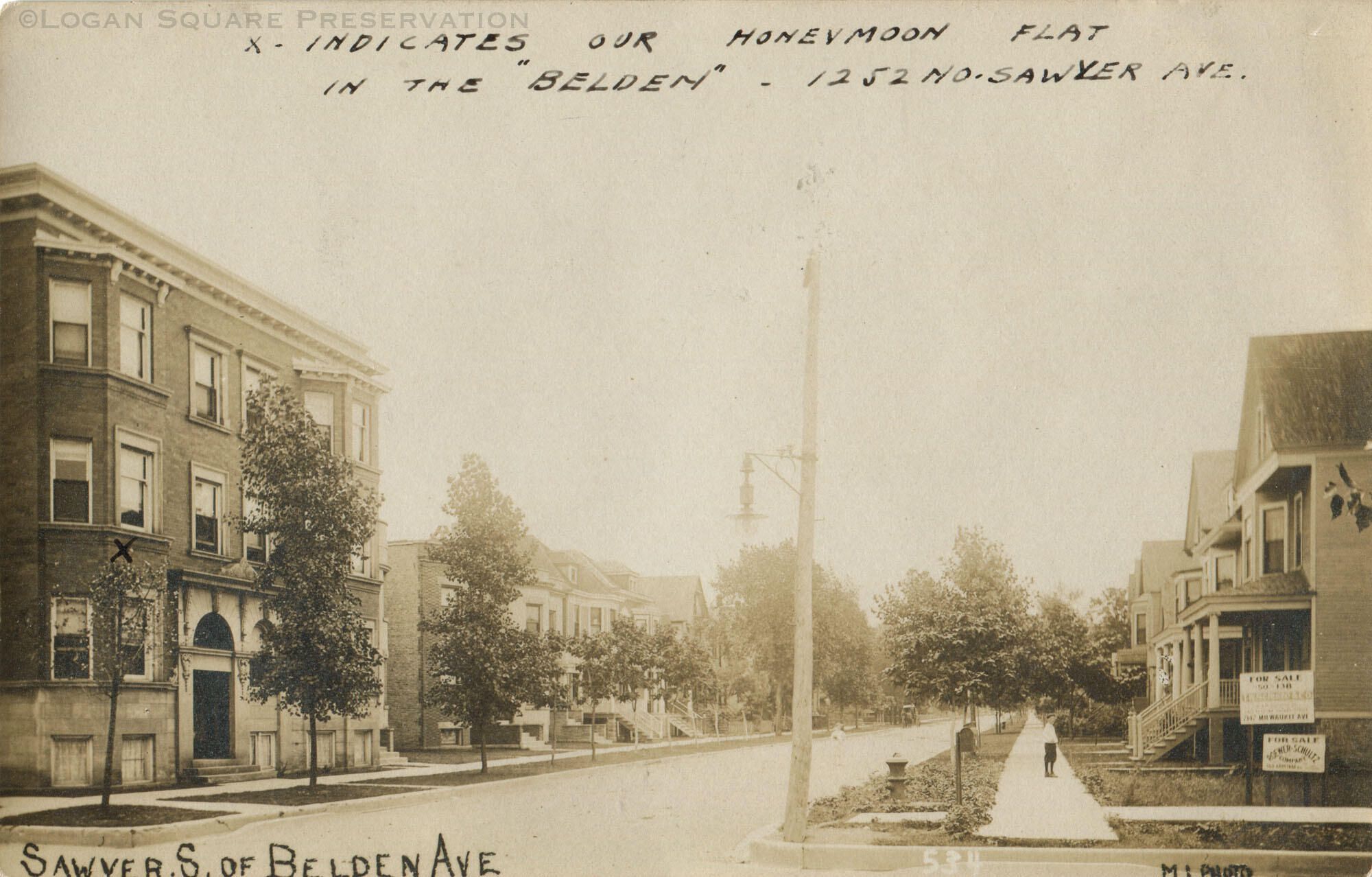 Real-photo postcard view looking south at apartments and frame houses on Sawyer Ave south of Belden, circa 1908. Second-floor apartment at 2257 N. Sawyer marked with "X", empty lot at 2256 N. Sawyer has For Sale sign by Roewer-Schultz Company.Subject