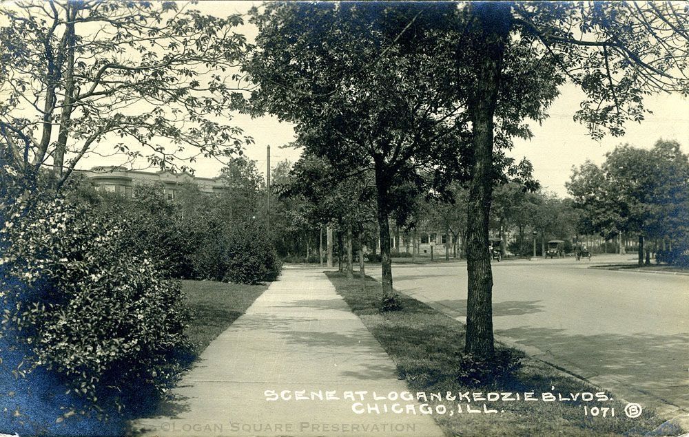 Real-photo postcard view looking northeast along sidewalk toward west end of Logan Boulevard with apartment buildings visible above bushes and automobiles on boulevard in distance, circa 1910-1915. C.R. Childs card #1071Subject Place