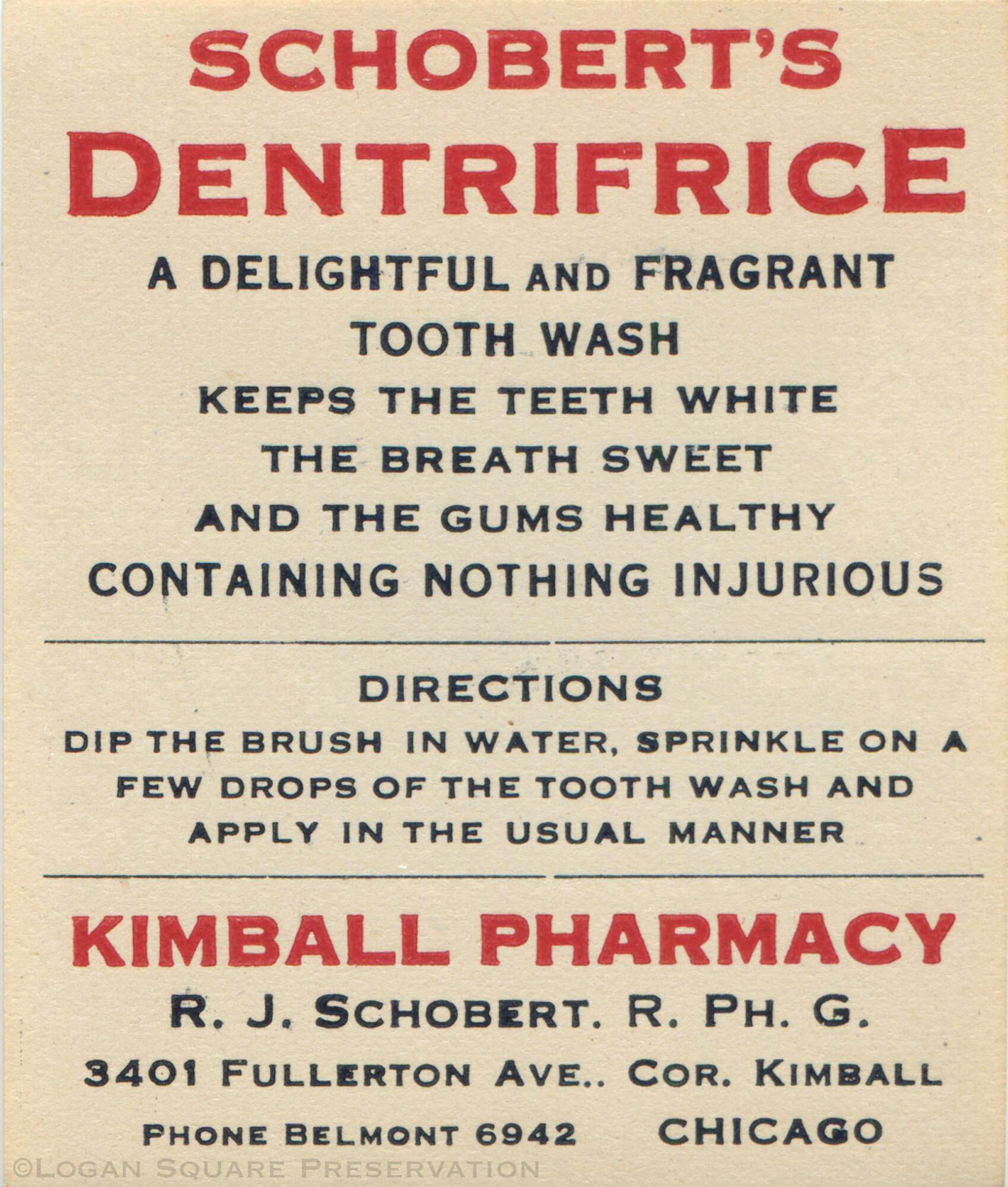 Unused gummed label for tooth wash sold by pharmacist R.J. Schobert, circa 1920s-1930sInscription/Signature/Marks