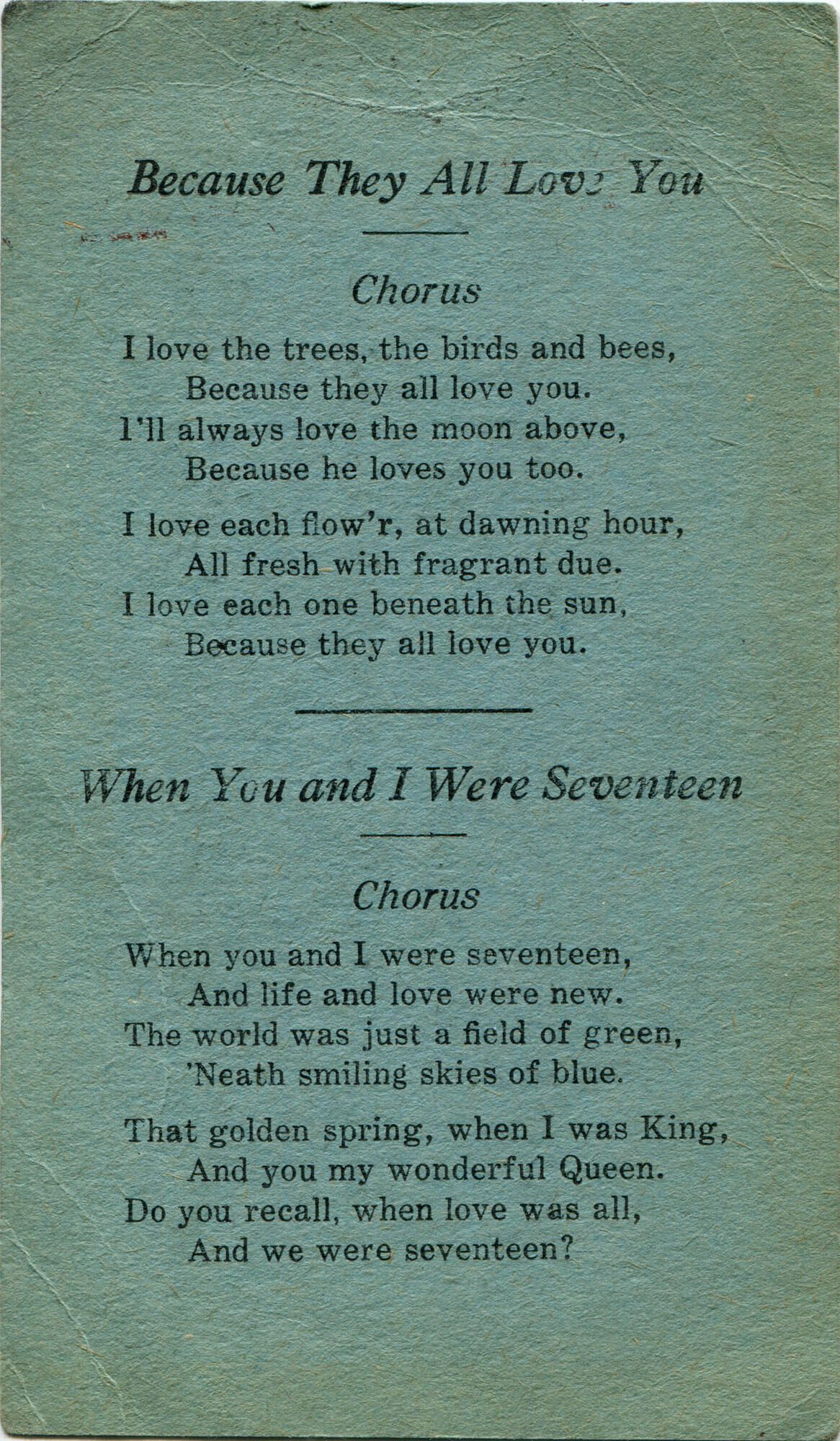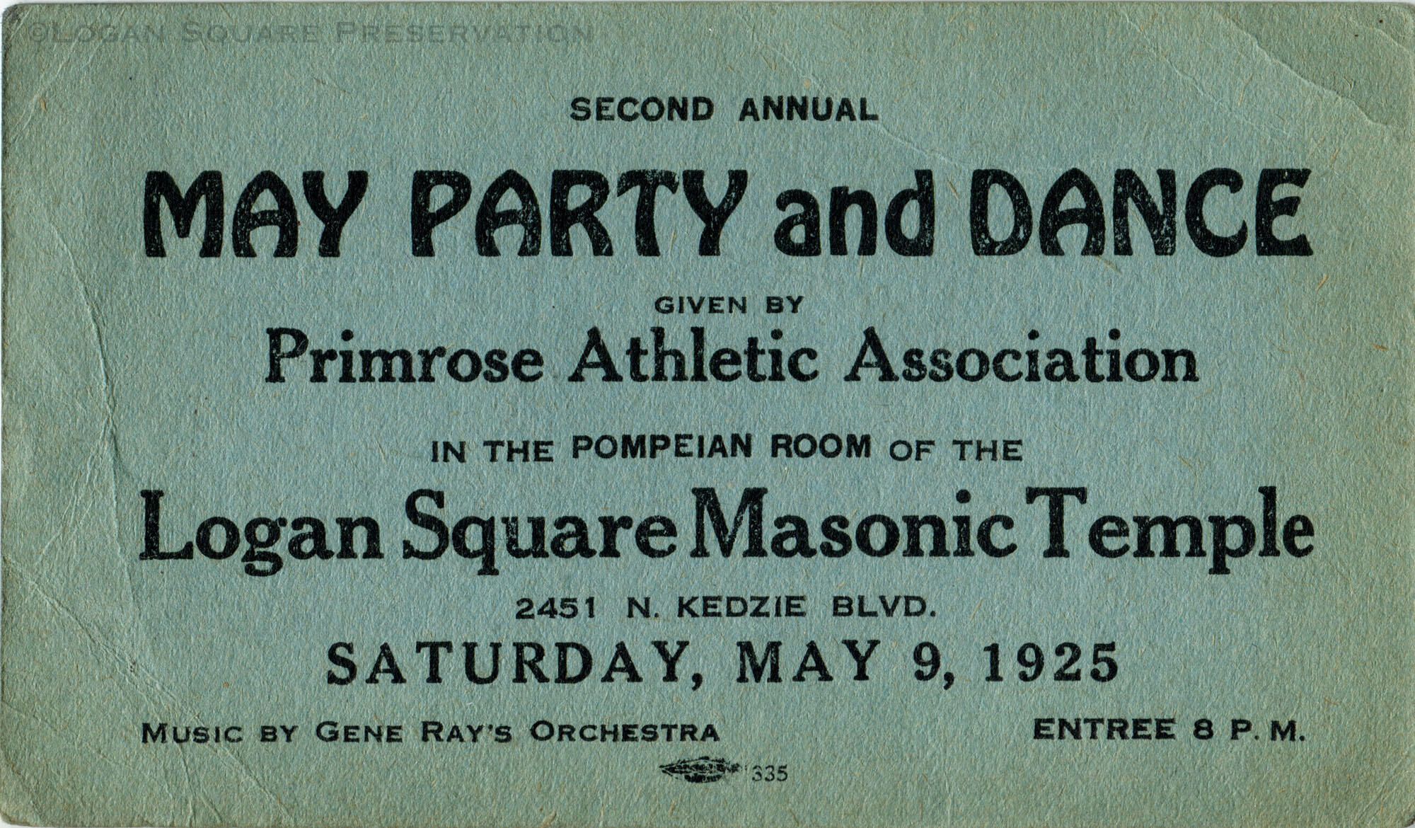 Invitation card to May 9, 1925 second-annual May party and dance in the Pompeian room of Logan Square Masonic Temple given by Primrose Athletic Association, with music by Gene Ray's Orchestra. Lyrics to "Because They All Love You" and "When You And I Were Seventeen" on back.Publication Details