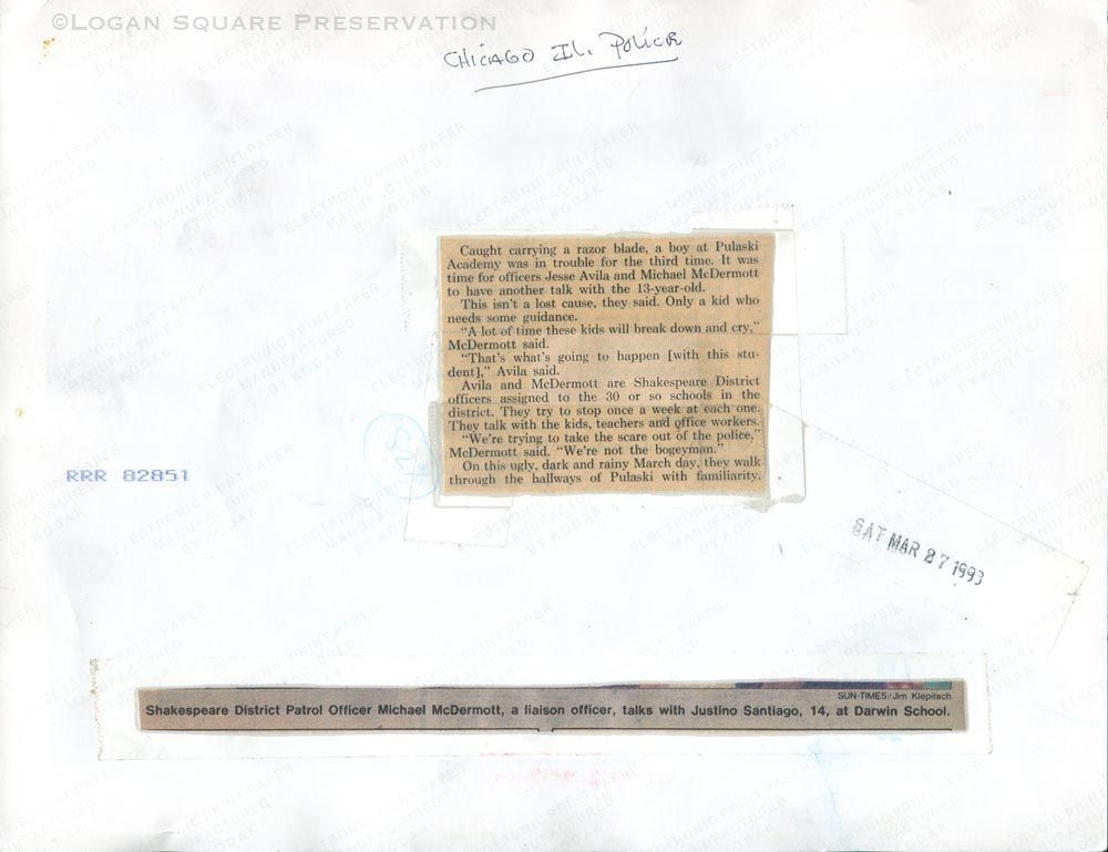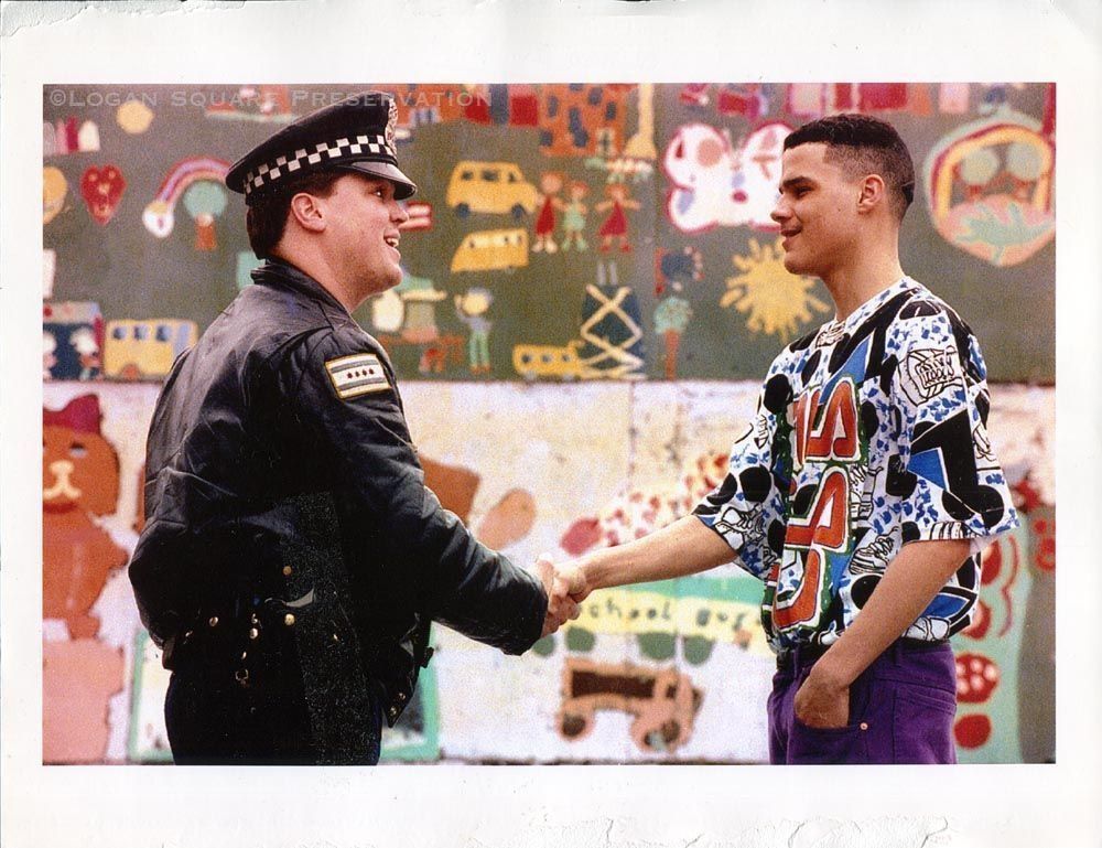 News photo of police officer Michael McDermott shaking hands with student Justino Santiago in front of colorful mural at Darwin School, 1993Photograph Details