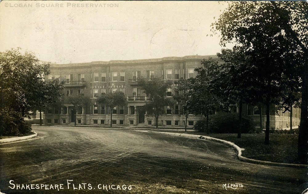 Real-photo postcard view looking east across dirt roadway at east end of Palmer Square to brick Shakespeare apartments built in 1907 by Ignaz Schwinn, circa 1909Subject Place