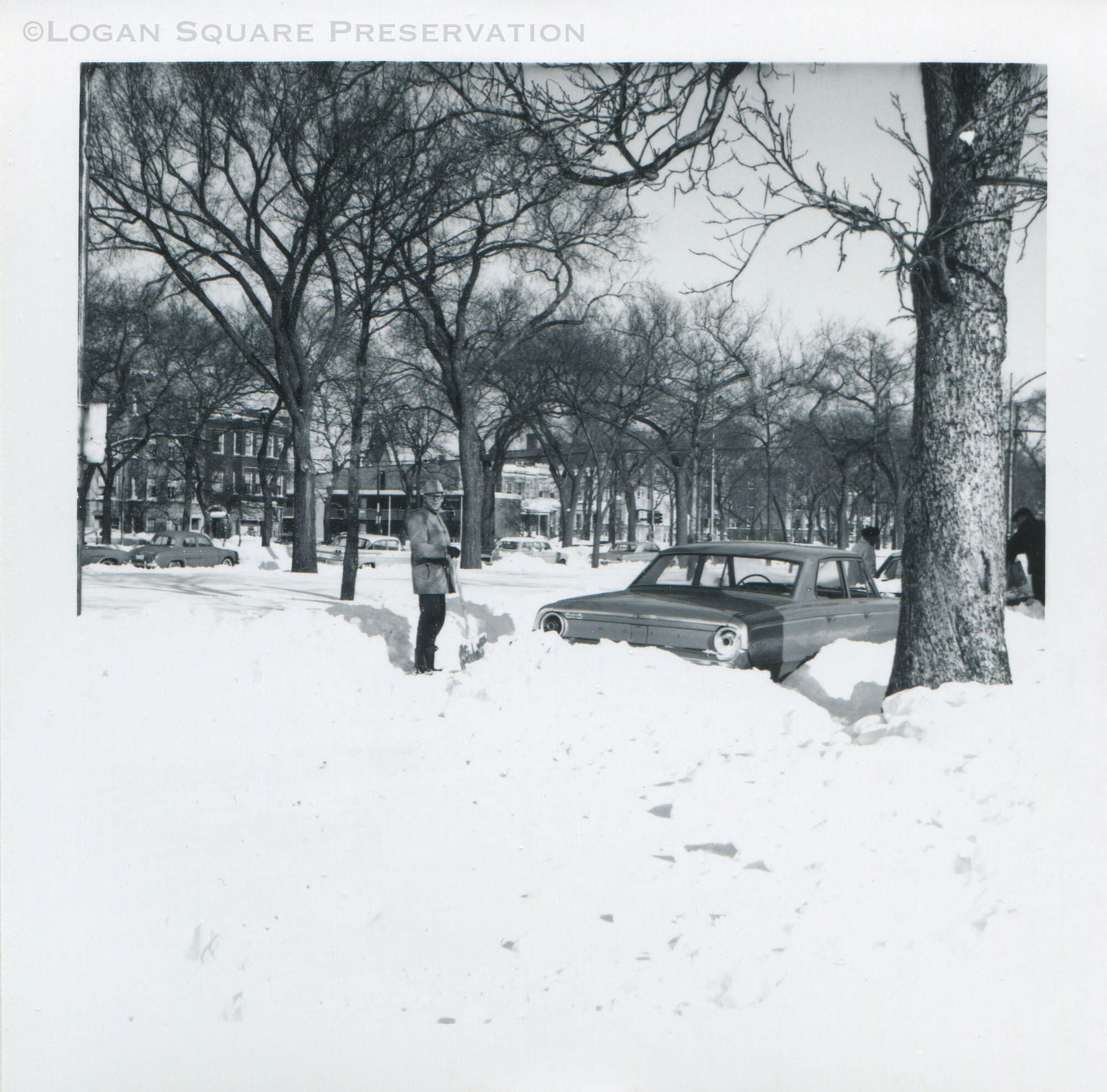 Gerald Slawin photo of man shovelling out parked car from snowbank on Logan Boulevard after Jan 1967 blizzardPhotograph Details