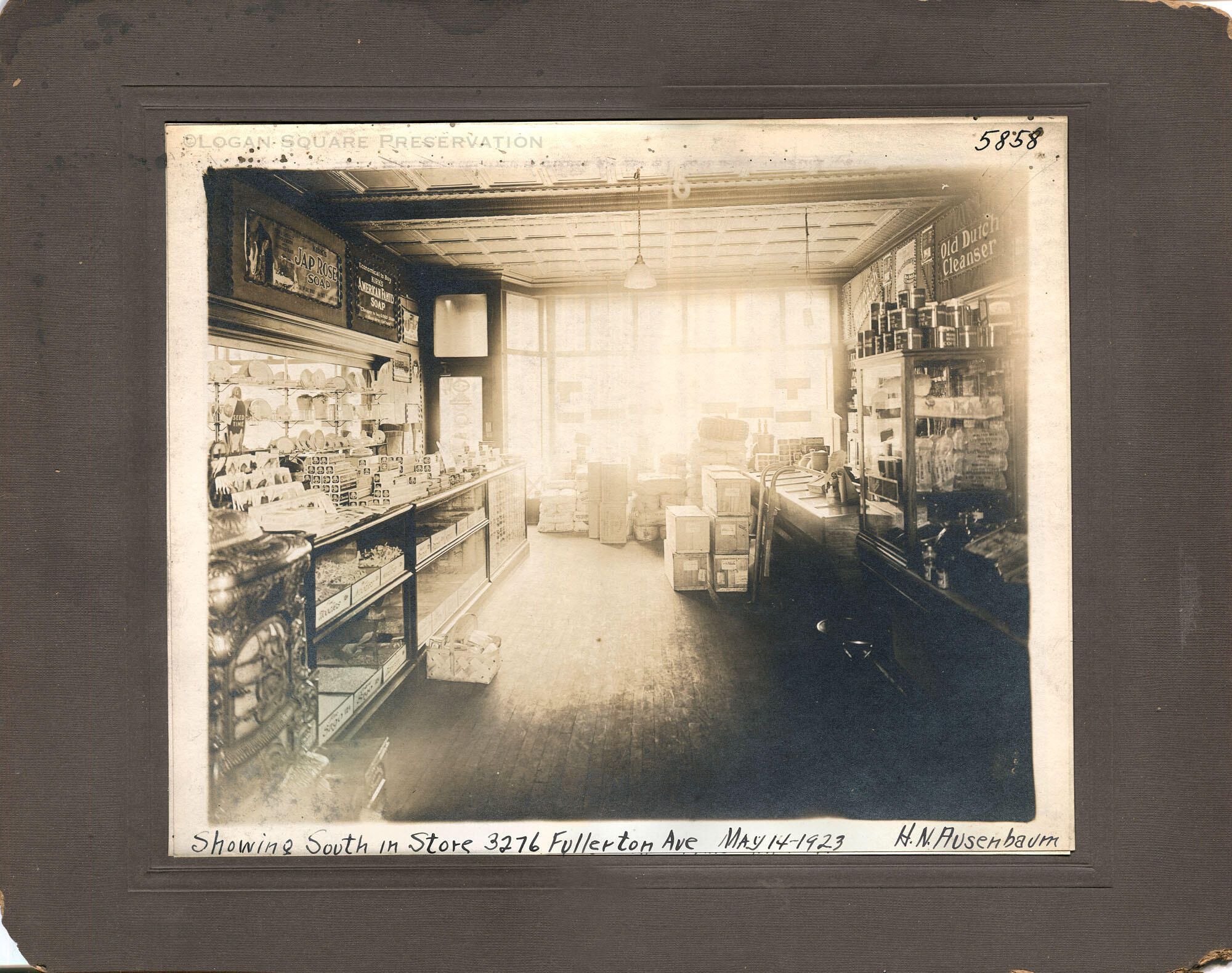 Oversized photograph mounted on pressed cardstock of Northwest Tea store as it looked four days after armed bandit held up cashier and took $125 from cash register. Employee Elmer Jacobsen of 2419 N Albany gave chase to fleeing robber and was shot in arm. Photo taken by detective Herbert N. Ausenbaum.Photograph Details