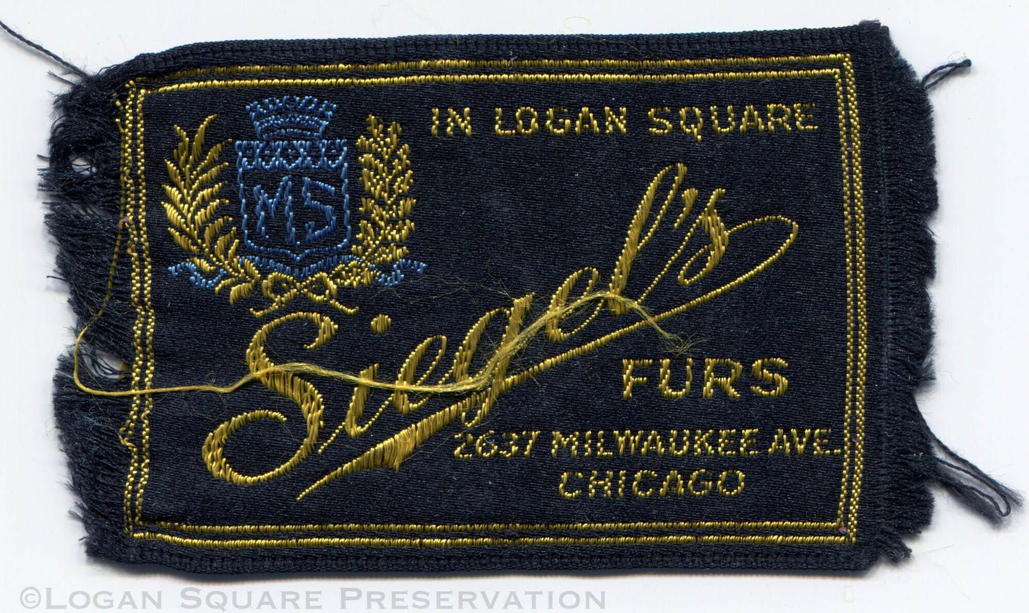Embroidered tag in gold and blue thread on black fabric, most likely from fur coat or jacketCollection