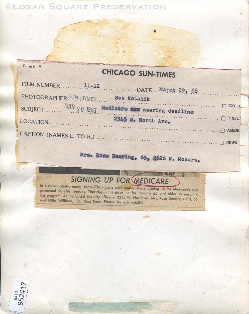 Form B-19 Chicago Sun-Times Film Number 11-12 Date March 29, 66 Photographer Bob Kotalik Subject Medicare nearing deadline Location 2345 W. North Ave. Caption (Names L. To R.) Mrs. Rose Deering, 65, 2639 N. Mozart. In a contemplative mood, these Chicagoans signed up for medicare's supplemental benefits Tuesday. Thursday is the deadline for persons 65 and older to enroll in the program. At the Social Security office at W. North. are Mrs. Rose Deering (left), 65, and Ollie Williams, 80.