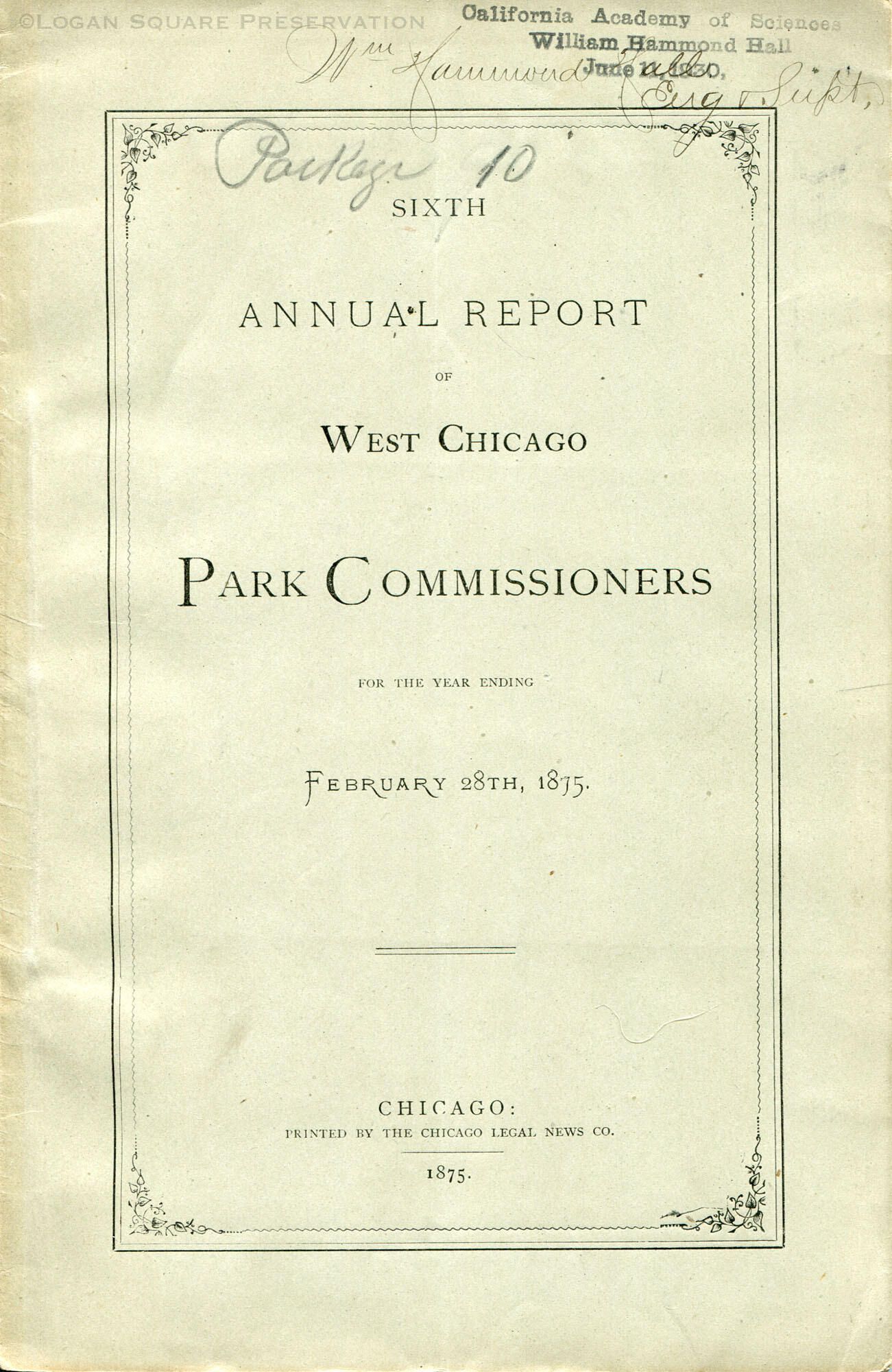 48-pg softcover-bound report of West Chicago Parks Commission for year ending Feb 28, 1875
