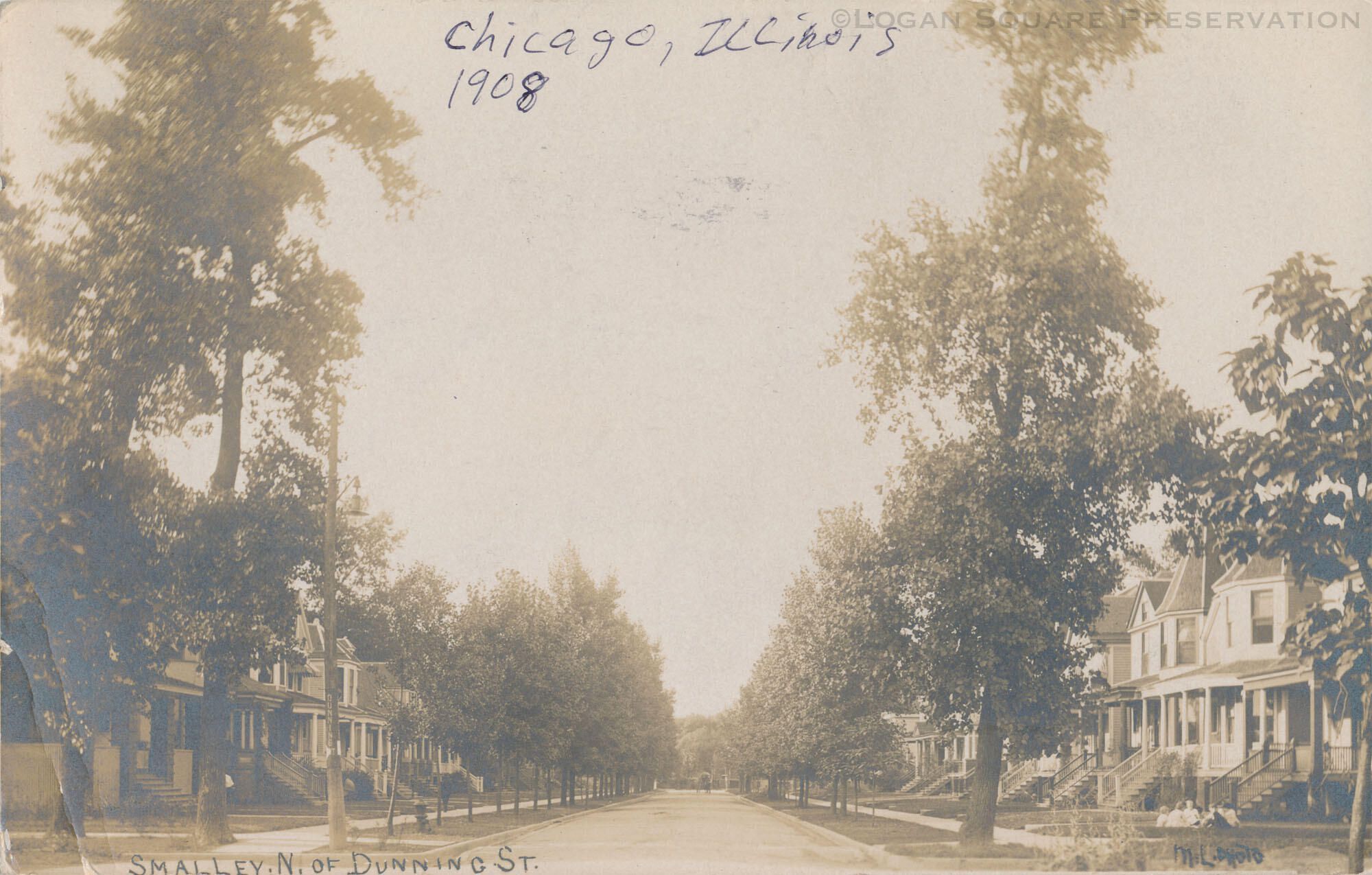 Real-photo postcard view looking north at frame houses on 2500 block of Bernard St (formerly Smalley Ct) from Altgeld St (formerly Dunning St), circa 1908Subject
