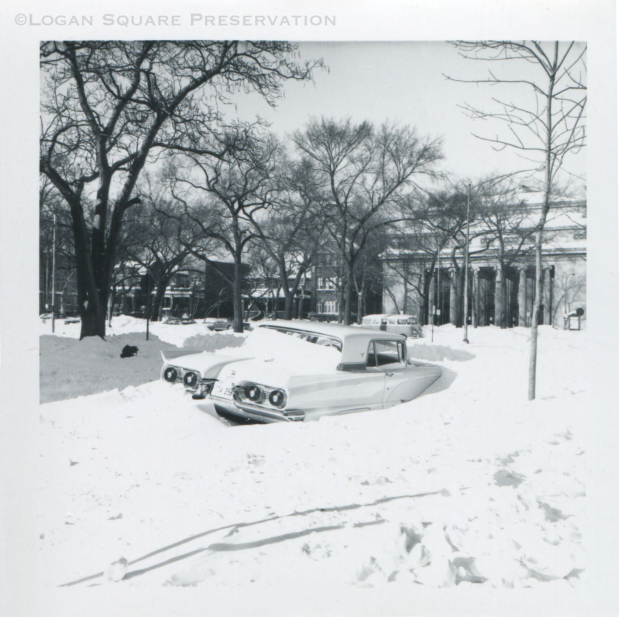 Gerald Slawin photo of parked car in snowdrift at Mozart St and Logan Boulevard after January 1967 blizzardPhotograph Details