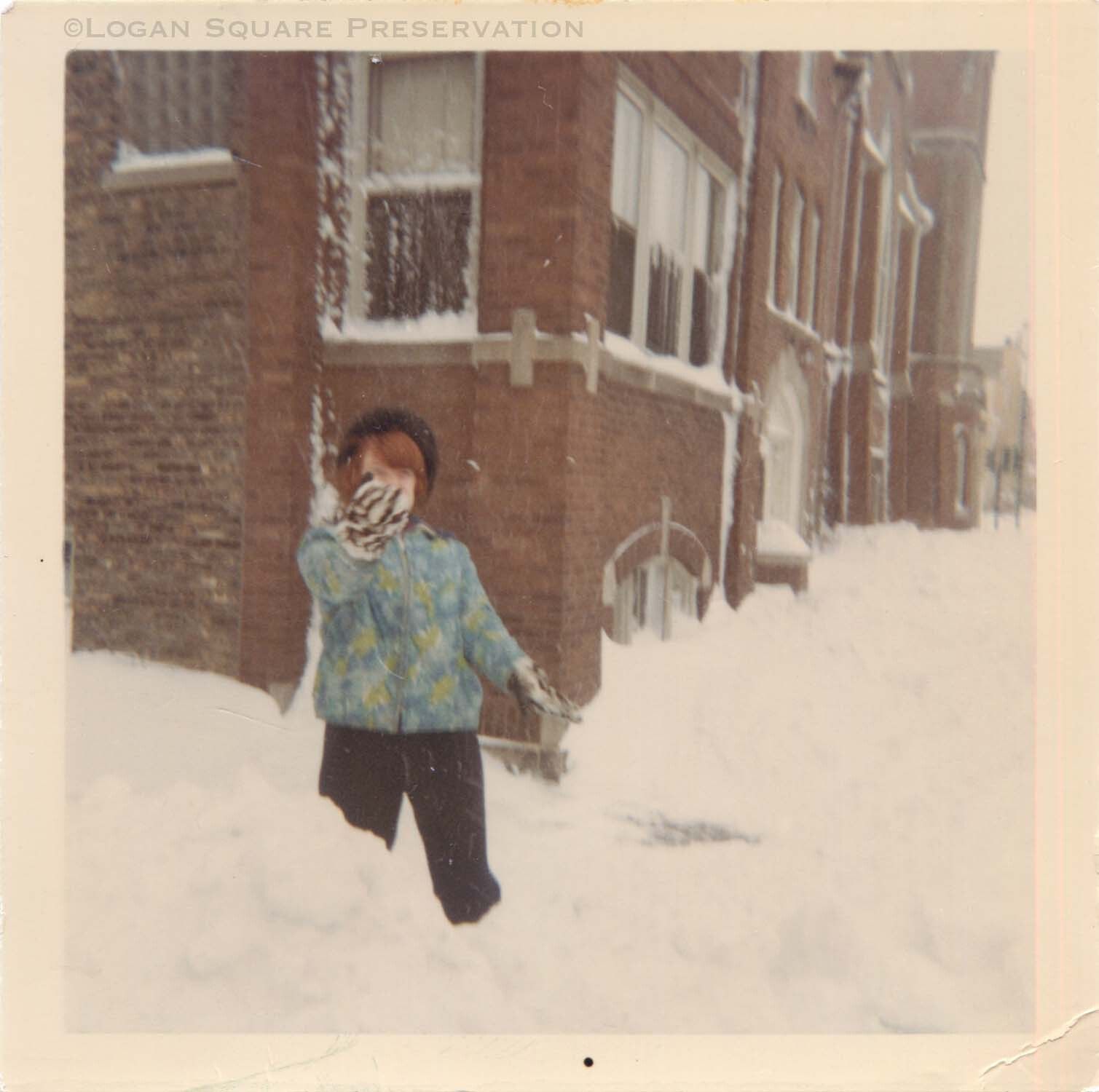 Snapshot photo of girl playing in deep snow in alley and on sidewalk next to 2611 N. Kimball, 1967Photograph Details