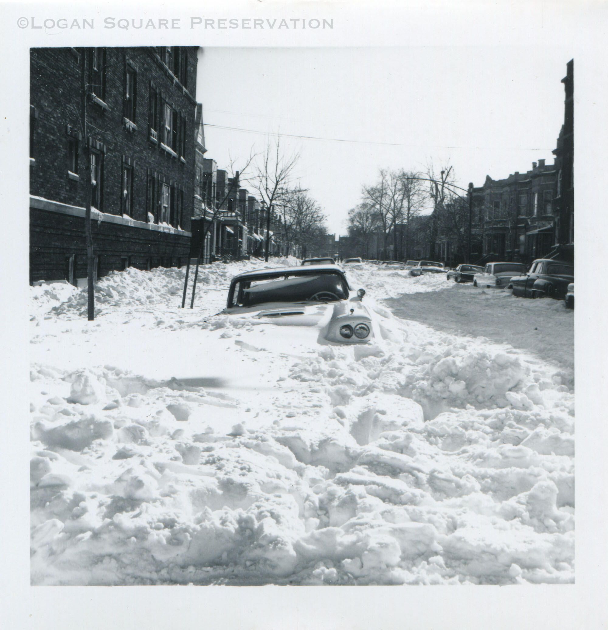 Gerald Slawin photo looking south on Mozart Street at snow drifts around parked carsPhotograph Details