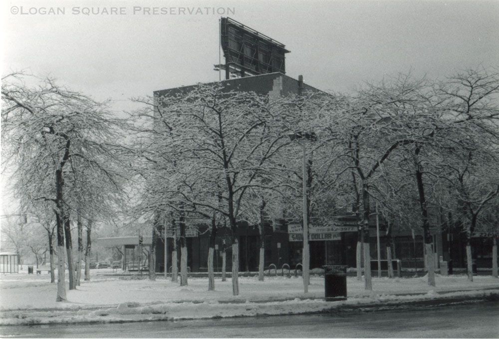 Black & white photo looking south from CTA bus turnaround toward snowy trees on plaza and back of billboard on top of 4-story Grace Furniture building, circa 2000-2010Photograph Details