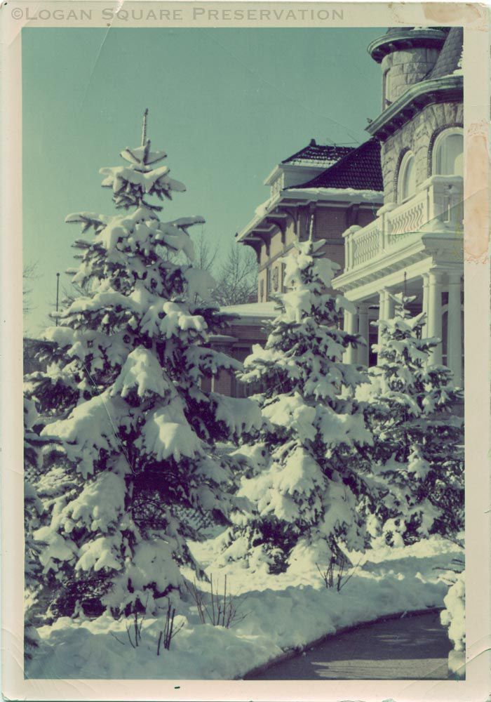 Snapshot photo of heavy snow on spruce trees in front yard of 2234 N. Kedzie Blvd on winter morning with front porch of next door houses in background, circa 1960sPhotograph Details