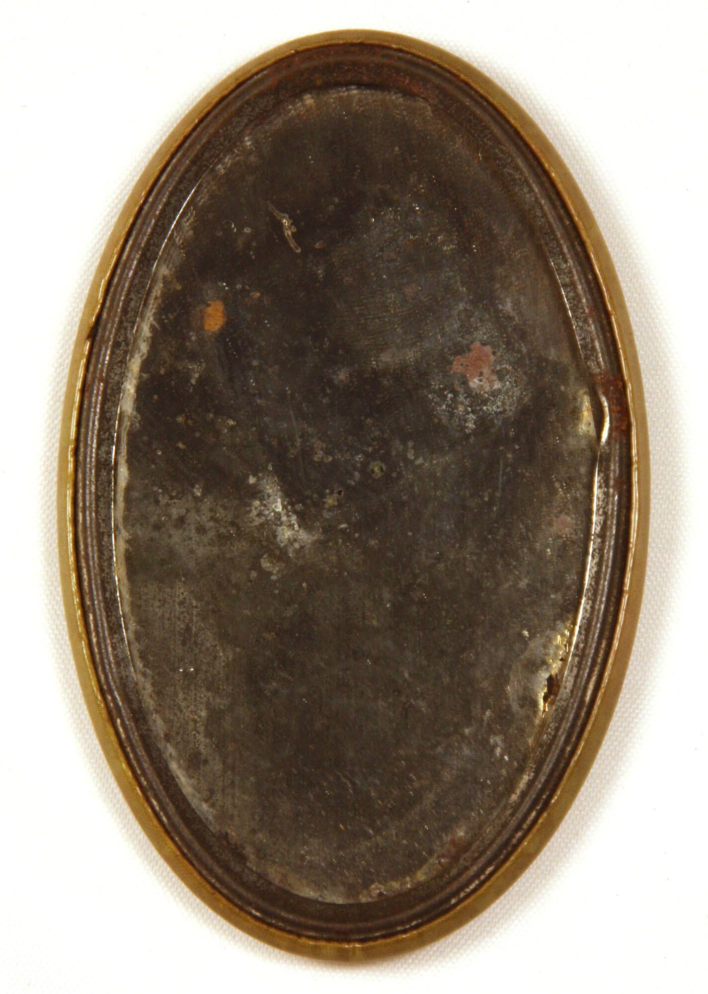 2.75" x 1.75" pocket mirror with painted portrait of young woman with cross necklace and gold lettering on back, circa 1910sDimensions
